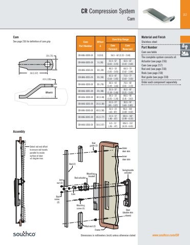 217CamPart NumberOffsetACam Grip RangeCam ForwardCam ReversedCR-846-1000-24 0 (0.0) 56.5 - 62 (2.23 - 2.44)CR-846-1005-24 5 (.20) 51.5 - 57 (2.03 - 2.25)61.5 - 67 (2.42 - 2.64)CR-846-1010-24 10 (.39) 46.5 - 52 (1.83 - 2.05)66.5 - 72 (2.62 - 2.84)CR-846-1015-24 15 (.59) 41.5 - 47 (1.64 - 1.85)71.5 - 77 (2.82 - 3.03)CR-846-1020-24 20 (.79) 36.5 - 42 (1.44 - 1.66)76.5 - 82 (3.01 - 3.23)CR-846-1025-24 25 (.98) 31.5 - 37 (1.24 - 1.46)81.5 - 87 (3.21 - 3.43)CR-846-1030-24 30 (1.18) 26.5 - 32 (1.05 - 1.26)86.5 - 92 (3.41 - 3.62)CR-846-1035-24 35 (1.38) 21.5 - 27 (.85 - 1.07)91.5 - 97 3.60 - 3.82)CR-846-1040-24 40 (1.58) 16.5 - 22 (.65 - 87)96.5 - 102 (3.80 - 4.02)CR-846-1045-24 45 (1.77) 11.5 - 17 (.46 - .67)101.5 - 107 (3.99 - 4.22)CR-846-1050-24 50 (1.97) 6.5 - 12 (.26 - .47)106.5 - 112 (4.19 - 4.41)19 (.75)50 (1.97) Offset A4.9 (.195)CamSee page 216 for definition of cam gripACTUAL SIZEDoor(double skin shown)SwinghandleactuatorFrameRodguide (2)Rod end (2)Rod (2)Rod actuator MountingbracketCamJamnut (2)Mountingscrew (4)Innerdoor skinOuterdoor skinRodscrew(2)Assemblywww.southco.com/CRSelect rod end offset to ensure rod travels parallel to inside surface of door ±5 degree max.Dimensions in millimeters (inch) unless otherwise statedCR Compression SystemCam Material and FinishStainless steelPart NumberCam see tableThe complete system consists of: Actuator (see page 216)Cam (see page 217)Rod end (see page 218)Rods (see page 218)Rod guide (see page 218)Order each component separately