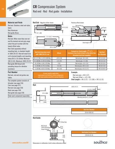 218Rod End - Negative offset shown Positive offset shownACTUAL SIZEØ 14(.575)14.8(.58)Ø 16(.63)10 Hex flatsM6 Thread (with prevailing torque feature) ACTUAL SIZEACTUAL SIZERod end gripM6 threaded stud(not supplied) DoorFrame Rod endRod guideStud lengthRodGasket22.7 (.89)117 (4.61)OffsetØ 24 (.94)25.9 (1.02)22.5 (.886)15.25(.600)1000 (39.37)8 (.315)Mounting hole Ø 8.5 (.33)Dimensions in millimeters (inch) unless otherwise statedCR Compression SystemRod end · Rod · Rod guide · Installationwww.southco.com/CRMaterial and FinishRod end: Stainless steel and nylon, blackRod: Aluminum Rod guide: Brass NotesRod end: When more than one rod end fits desired rod end grip range select the part number with the lowest offset value Rod: Sold separately without mounting hole, in standard length of 1000 (39.37). Rod will need to be cut to desired lengths and mounting holes Ø 8.5 (.33) drilled. Minimum 300 (11.81), Maximum 1000 (39.37)Rod guide: M6 thread with prevailing torque for vibration resistancePart NumberRod end, rod and rod guides see tablesThe complete system consists of: Actuator (see page 216)Cam (see page 217)Rod end (see page 218)Rods (see page 218)Rod guide (see page 218)Order each component separatelyExample:Rod end grip = 40 (1.57)Rod end offset = +15 (.59)Stud Length = 40 (1.57) - 1.5 (.06) = 38.5 (1.51)Rod End Grip when used with 1000 (39.37) rod OffsetFormula for Stud Length ( ) Distance from front of door to the end of the threaded stud (not supplied)Rod End Part Number40 (1.57) Min. to 124 (4.88) Max. +30 (1.18) Rod end grip -16.5 (.65) CR-51-30-2425 (.98) Min. to 109 (4.29) Max. +15 (.59) Rod end grip -1.5 (.06) CR-51-15-2410 (.39) Min. to 94 (3.70) Max. 0 (0) Rod end grip +13.5 (.53) CR-50-01-245 (.20) Min. to 79 (3.11) Max. -15 (.59) Rod end grip +28.5 (1.12) CR-52-15-245 (.20) Min. to 64 (2.52) Max. -30 (1.18) Rod end grip +43.5 (1.71) CR-52-30-24RodRod GuideRod Part NumberCR-64-1000-50For your specific application requirement use Southco's online configurator, visit www.southco.com/CR or contact SouthcoRod Guide Part NumberCR-843-01-26+2.5-0+.1-0