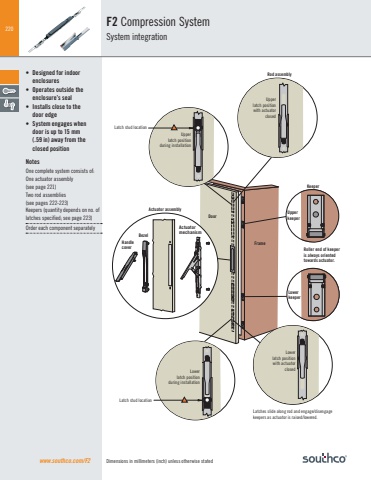 220UpperkeeperUpperlatch positionduring installationLowerkeeperRoller end of keeperis always oriented towards actuator.ActuatormechanismLatches slide along rod and engage/disengage keepers as actuator is raised/lowered.Upperlatch positionwith actuatorclosedLowerlatch positionwith actuatorclosed Lowerlatch positionduring installationLatch stud locationLatch stud locationHandlecoverActuator assemblyRod assemblyKeeperBezelDoorFramewww.southco.com/F2 Dimensions in millimeters (inch) unless otherwise statedF2 Compression SystemSystem integration• Designed for indoor enclosures• Operates outside the enclosure’s seal• Installs close to the door edge• System engages when door is up to 15 mm (.59 in) away from the closed positionNotesOne complete system consists of:One actuator assembly (see page 221)Two rod assemblies (see pages 222-223) Keepers (quantity depends on no. of latches specified; see page 223)Order each component separately