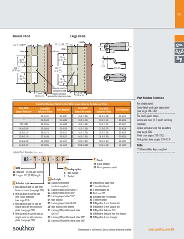 225Dimensions in millimeters (inch) unless otherwise statedFor single point:Order latch and cam separately (see page 186-187)For multi-point order:Latch and cam (if 3 point latching required) Linear actuator and rod adaptors(see page 226) Rods (see pages 230-233) Rod guides (see pages 230-233) Note*2 Overmolded keys supplied150 (5.9 )25 (.98 )125 (4.92 )50 (1.97 )Material must beremoved for DIN locking versions, optional for other lock styles+.2-0 +.008-0 25 (.98 ) +.2-0 +.008-0+.2-0+.008-050 (1.97 )+.2-0+.008-0 50 (1.97 )+.2-0+.008-050 (1.97 )+.2-0+.008-0+0.4-0+.016-0+0.4-0+.016-036±4(1.42±.16)36±4(1.42±.16)FrameDoor FrameDoorCam Part Number Table For Use With Linear Actuator Or Actuator PlateGrip With Linear ActuatorGrip With Actuator Plate Part Number Grip With Linear ActuatorGrip With Actuator Plate Part Number~ 10.3 (.41) E5-6107 36.9 (1.45) 26.3 (1.04) E5-6115~ 12.3 (.48) E5-6108 38.9 (1.53) 28.3 (1.11) E5-611624.9 (.98) 14.3 (.56) E5-6109 40.9 (1.61) 30.3 (1.19) E5-611726.9 (1.06) 16.3 (.64) E5-6110 42.9 (1.69) 32.3 (1.27) E5-611828.9 (1.14) 18.3 (.72) E5-6111 44.9 (1.76) 34.3 (1.35) E5-611930.9 (1.22) 20.3 (.80) E5-6112 46.9 (1.85) 36.3 (1.43) E5-612032.9 (1.30) 22.3 (.88) E5-6113 48.9 (1.93) 38.3 (1.51) E5-612134.9 (1.37) 24.3 (.96) E5-6114 50.9 (2.00) 40.3 (1.59) E5-612217 (.67)2 x 8.14 (.16)19 (.75)45 (1.77)Medium H3-50 Large H3-60___________________________________________________________________________ Part Number SelectionS Sealing option0 Non-sealed1 SealedH3 - T - A L - S FLatch Part Number (no cam)T Size50 Medium - 152 (5.98) length60 Large - 177 (6.97) lengthL Lock style00 Locking DIN profile (no lock supplied) 01 Locking keyed alike CH751*02 Locking keyed alike 300* 03 Locking keyed alike 333*04 Non-locking05 Locking keyed alike HL45020 Non-locking with detent21 Locking DIN profile keyed alike CH751*22 Locking DIN profile keyed alike 300* 23 Locking DIN profile keyed alike 333*24 DIN without Lock Plug40 3 mm Double-bit41 5 mm Double-bit42 Bellcore 21643 Bellcore Hex-Pin Recess47 8 mm triangle70 DIN profile 3 mm Double-bit71 DIN profile 5 mm Double-bit72 DIN profile Bellcore 21673 DIN Profile Bellcore Hex-Pin Recess77 DIN profile 8 mm triangleA Actuator style1 No padlock hasp for use with linear actuator (see page 226)2 With padlock hasp for use with linear actuator (see page 226)3 No padlock hasp for use as single point or with actuator plate (see page 227)4 With padlock hasp for use as single point or with actuator plate (see page 227) F Finish44 Satin chrome50 Black powder coatedwww.southco.com/H3