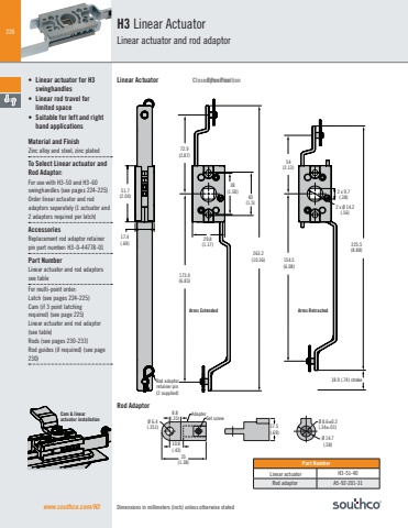 226Ø 6.4(.251)8.8(.35) AdapterSet screw10.8(.43)35(1.38)17.5 (.69)Ø 8.6±0.2(.34±.01)Ø 14.7(.58)51.7(2.04)17.4(.69)29.8(1.17)38(1.50)40(1.5)263.2(10.36)2 x 9.7(.38)225.5(8.88)2 x Ø 14.2(.56)Arms Extended Arms Retracted173.4(6.83)72.9(2.87)Rod adaptorretainer pin(2 supplied)154.5(6.08)54(2.13)18.9 (.74) strokePart NumberLinear actuator H3-51-40Rod adaptor A5-92-201-31www.southco.com/H3 Dimensions in millimeters (inch) unless otherwise statedHardware packCam & linear actuator installation 2 x M4x0.7x25,pan head No. 2 pozi driv, self tapping screws for gearbox installationM6x1x14cam screwLock plug endmounting bracketPivot end mounting bracketDummy cam used for no center point latching onlyM4x0.7x12, pan head, No.2 pozi drive, self tapping screw for lock plug bracket installWave washerH3 Linear ActuatorLinear actuator and rod adaptor• Linear actuator for H3 swinghandles • Linear rod travel forlimited space • Suitable for left and right hand applicationsMaterial and FinishZinc alloy and steel, zinc plated To Select Linear actuator and Rod Adaptor:For use with H3-50 and H3-60 swinghandles (see pages 224-225)Order linear actuator and rod adaptors separately (1 actuator and 2 adaptors required per latch)AccessoriesReplacement rod adaptor retainer pin part number: H3-0-44778-01Part Number Linear actuator and rod adaptors see tableFor multi-point order:Latch (see pages 224-225) Cam (if 3 point latching required) (see page 225) Linear actuator and rod adaptor (see table)Rods (see pages 230-233) Rod guides (if required) (see page 230) Linear Actuator Closed Position Open PositionRod Adaptor