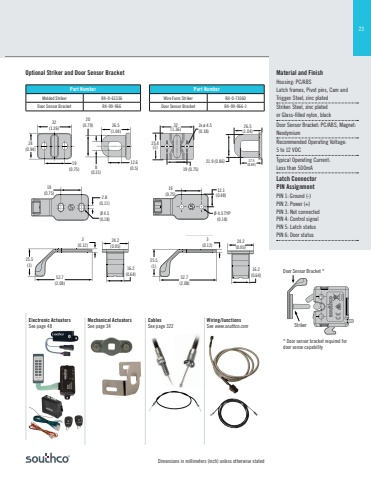 23Dimensions in millimeters (inch) unless otherwise statedMechanical ActuatorsSee page 34CablesSee page 322Wiring/JunctionsSee www.southco.comElectronic ActuatorsSee page 48Material and FinishHousing: PC/ABSLatch frames, Pivot pins, Cam and Trigger: Steel, zinc platedStriker: Steel, zinc platedor Glass-filled nylon, blackDoor Sensor Bracket: PC/ABS, Magnet: NeodymiumRecommended Operating Voltage:5 to 12 VDCTypical Operating Current:Less than 500mALatch ConnectorPIN AssignmentPIN 1: Ground (-)PIN 2: Power (+)PIN 3: Not connectedPIN 4: Control signalPIN 5: Latch statusPIN 6: Door statusPart NumberMolded Striker R4-0-61336Door Sensor Bracket R4-99-966Part NumberWire Form Striker R4-0-71060Door Sensor Bracket R4-99-966-1Optional Striker and Door Sensor Bracket* Door sensor bracket required for door sense capability Door Sensor Bracket *Striker32(1.26)24(0.94)19(0.75)20(0.79)8(0.31)12.6(0.5)19(0.75)2.8(0.11)Ø 4.5(0.18)3(0.12)16.2(0.64)24.2(0.95)52.7(2.08)25.5(1)26.5(1.04)32(1.26)24(0.94)19(0.75)20(0.79)8(0.31)12.6(0.5)19(0.75)2.8(0.11)Ø 4.5(0.18)3(0.12)16.2(0.64)24.2(0.95)52.7(2.08)25.5(1)26.5(1.04) 32(1.26)24(0.94)19(0.75)20(0.79)8(0.31)12.6(0.5)19(0.75)2.8(0.11)Ø 4.5(0.18)3(0.12)16.2(0.64)24.2(0.95)52.7(2.08)25.5(1)26.5(1.04)32(1.26)24(0.94)19(0.75)20(0.79)8(0.31)12.6(0.5)19(0.75)2.8(0.11)Ø 4.5(0.18)3(0.12)16.2(0.64)24.2(0.95)52.7(2.08)25.5(1)26.5(1.04)32(1.26)24(0.94)19(0.75)20(0.79)8(0.31)12.6(0.5)19(0.75)2.8(0.11)Ø 4.5(0.18)3(0.12)16.2(0.64)24.2(0.95)52.7(2.08)25.5(1)26.5(1.04)32(1.26)24(0.94)19(0.75)20(0.79)8(0.31)12.6(0.5)19(0.75)2.8(0.11)Ø 4.5(0.18)3(0.12)16.2(0.64)24.2(0.95)52.7(2.08)25.5(1)26.5(1.04)32(1.26)24(0.94)19(0.75)20(0.79)8(0.31)12.6(0.5)19(0.75)2.8(0.11)Ø 4.5(0.18)3(0.12)16.2(0.64)24.2(0.95)52.7(2.08)25.5(1)26.512.1 (1.04)(0.48)19(0.75)Ø 4.5 TYP(0.18)32(1.36) 26.5(1.04)21.9 (0.86) 17.5(0.69)2x ø 4.5(0.18)25.4(1)19 (0.75)