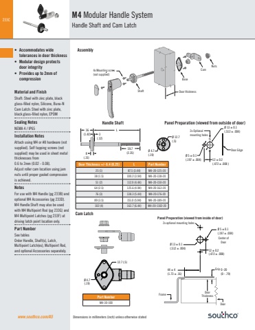 233Cwww.southco.com/A5• Accommodates widetolerances in door thickness• Modular design protectsdoor integrity• Provides up to 2mm ofcompressionMaterial and FinishShaft: Steel with zinc plate, black glass-filled nylon, Silicone, Buna-NCam Latch: Steel with zinc plate, black glass-filled nylon, EPDMSealing NotesNEMA 4 / IP65Installation NotesAttach using M4 or #8 hardware (not supplied). Self tapping screws (not supplied) may be used in sheet metal thicknesses from0.6 to 2mm (0.02 - 0.08).Adjust roller cam location using jam nuts until proper gasket compression is achieved.NotesFor use with M4 Handle (pg 233B) and optional M4 Accessories (pg 233D). M4 Handle Shaft may also be used with M4 Multipoint Rod (pg 233G) and M4 Multipoint Latches (pg 233F) at driving latch point location only.Part NumberSee tablesOrder Handle, Shaft(s), Latch, Multipoint Latch(es), Multipoint Rod, and optional Accessories separately.M4 Modular Handle SystemHandle Shaft and Cam LatchHandle ShaftCam LatchAssemblyPanel Preparation (viewed from outside of door)Door Thickness +/- 6.4 (0.25) L Part Number25 (1) 87.5 (3.44) M4-20-125-2038 (1.5) 100.2 (3.94) M4-20-138-2051 (2) 112.9 (4.44) M4-20-150-2064 (2.5) 125.6 (4.94) M4-20-163-2076 (3) 138.3 (5.44) M4-20-176-2089 (3.5) 151.0 (5.94) M4-20-189-20102 (4) 163.7 (6.44) M4-20-1102-20Ø 4.7(.19)12.7 (.5)Ø 5 ± 0.1(.197 ± .004)12 ± 0.2(.472 ± .008)Ø 13 ± 0.1(.512 ± .004)44 ± 4(1.73 ± .16)0 -20(0 - .79)Ø 5 ± 0.1(.197 ± .004)Ø 4.7(.19)12.7 (.5)Ø 5 ± 0.1(.197 ± .004)12 ± 0.2(.472 ± .008)Ø 13 ± 0.1(.512 ± .004)44 ± 4(1.73 ± .16)0 -20(0 - .79)Ø 5 ± 0.1(.197 ± .004)Part NumberM4-30-100L59.7(2.35) 8(.31)36(1.42) 3(.12) Ø 12.7(.5)Ø 5 ± 0.1(.197 ± .004)Ø 13 ± 0.1(.512 ± .004)12 ± 0.2(.472 ± .008 )Ø 4.7(.19)2x Optional mounting holesDoor EdgeØ 4.7(.19)12.7 (.5)Ø 5 ± 0.1(.197 ± .004)12 ± 0.2(.472 ± .008)Ø 13 ± 0.1(.512 ± .004)44 ± 4(1.73 ± .16)0 -20(0 - .79)Ø 5 ± 0.1(.197 ± .004)Panel Preparation (viewed from inside of door)DoorThicknessCenter ofDoorGrip2x optional mounting holesDoorFrameL59.7(2.35) 8(.31)36(1.42) 3(.12) Ø 12.7(.5)Ø 5 ± 0.1(.197 ± .004)Ø 13 ± 0.1(.512 ± .004)12 ± 0.2(.472 ± .008 )Ø 4.7(.19)4x Mounting screw (not supplied)Door thickness ShaftBaseCamNutsDimensions in millimeters (inch) unless otherwise stated