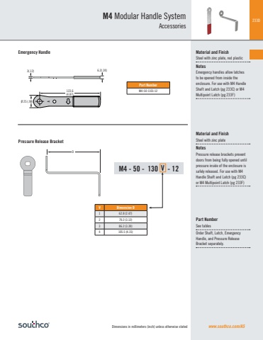 233Dwww.southco.com/A5M4 Modular Handle SystemAccessoriesV Dimension D1 62.8 (2.47)2 79.2 (3.12)3 86.2 (3.39)4 105.5 (4.15)Part NumberM4-50-1101-12Emergency HandleM4 - 50 - 130 V - 12D3(.12) 6.2(.24)123.6(4.87)Ø 25 (.98)Pressure Release BracketD3(.12) 6.2(.24)123.6(4.87)Ø 25 (.98)Material and FinishSteel with zinc plate, red plasticNotesEmergency handles allow latches to be opened from inside the enclosure. For use with M4 Handle Shaft and Latch (pg 233C) or M4 Multipoint Latch (pg 233F)Material and FinishSteel with zinc plateNotesPressure release brackets prevent doors from being fully opened until pressure inside of the enclosure is safely released. For use with M4 Handle Shaft and Latch (pg 233C) or M4 Multipoint Latch (pg 233F)Part NumberSee tablesOrder Shaft, Latch, Emergency Handle, and Pressure Release Bracket separately.Dimensions in millimeters (inch) unless otherwise stated