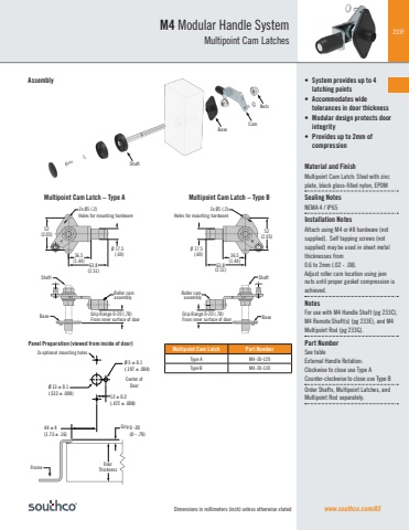 233Fwww.southco.com/A5• System provides up to 4 latching points• Accommodates wide tolerances in door thickness• Modular design protects door integrity• Provides up to 2mm of compressionMaterial and FinishMultipoint Cam Latch: Steel with zinc plate, black glass-filled nylon, EPDMSealing NotesNEMA 4 / IP65Installation NotesAttach using M4 or #8 hardware (not supplied). Self tapping screws (not supplied) may be used in sheet metal thicknesses from0.6 to 2mm (.02 - .08).Adjust roller cam location using jam nuts until proper gasket compression is achieved.NotesFor use with M4 Handle Shaft (pg 233C), M4 Remote Shaft(s) (pg 233E), and M4 Multipoint Rod (pg 233G).Part NumberSee tableExternal Handle Rotation:Clockwise to close use Type ACounter-clockwise to close use Type BOrder Shafts, Multipoint Latches, and Multipoint Rod separately.Multipoint Cam Latch – Type A Multipoint Cam Latch – Type BMultipoint Cam Latch Part NumberType A M4-30-120Type B M4-30-130M4 Modular Handle SystemMultipoint Cam LatchesAssemblyShaftBaseCamNutsØ 4.7(.19)12.7 (.5)Ø 5 ± 0.1(.197 ± .004)12 ± 0.2(.472 ± .008)Ø 13 ± 0.1(.512 ± .004)44 ± 4(1.73 ± .16)0 -20(0 - .79)Ø 5 ± 0.1(.197 ± .004)Panel Preparation (viewed from inside of door)DoorThicknessCenter ofDoorGrip2x optional mounting holesFrame36.5(1.44)36.5(1.44)52(2.05)52(2.05)63.8(2.51)63.8(2.51)Ø 17.5 (.69)Ø 17.5 (.69)2x Ø5 (.2) 2x Ø5 (.2)Holes for mounting hardwareShaftBaseRoller cam assemblyGrip Range 0-20 (.78)From inner surface of doorRoller cam assemblyShaftBase Grip Range 0-20 (.78)From inner surface of doorHoles for mounting hardware36.5(1.44)36.5(1.44)52(2.05)52(2.05)63.8(2.51)63.8(2.51)Ø 17.5 (.69)Ø 17.5 (.69)2x Ø5 (.2) 2x Ø5 (.2)Dimensions in millimeters (inch) unless otherwise stated