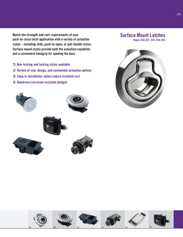 Match the strength and cost requirements of your push-to-close latch application with a variety of actuation styles – including slide, push-to-open, or pull-handle styles. Surface mount styles provide both the actuation capability and a convenient handgrip for opening the door. Non-locking and locking styles available Variety of size, design, and convenient actuation options Snap-in installation styles reduce installed cost Numerous corrosion resistant designsSurface Mount LatchesPages 250-251, 253, 256-285CM-2 MP CM-5 CM-1 CM-9 M1 A3 93 64 R3235
