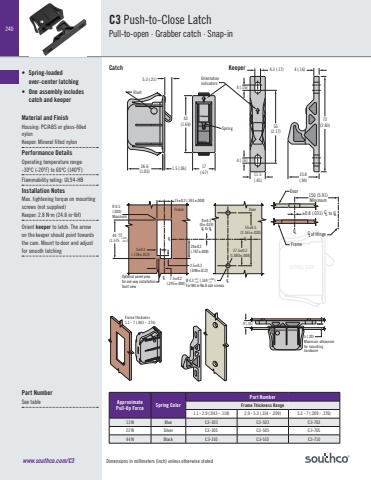 Dimensions in millimeters (inch) unless otherwise stated240www.southco.com/C3ACTUAL SIZEApproximate Pull-Up Force Spring ColorPart NumberFrame Thickness Range1.1 - 2.9 (.043 - .114) 2.9 - 5.3 (.114 - .209) 5.3 - 7 (.209 - .276)13 N Blue C3-303 C3-503 C3-70322 N Silver C3-305 C3-505 C3-70544 N Black C3-310 C3-510 C3-710C3 Push-to-Close LatchPull-to-open · Grabber catch · Snap-inCatchPart NumberSee tableKeeper17(.67)43(1.69)1.5 (.06) 26.6(1.05)Rivet4 (.16)4 (.16)55(2.17)4.3 (.17)23.8(.94)4 (.16)72(2.83)5.3 (.21)11.5(.45)Orientation indicatorsSpringCLCLCLCL7.5±0.2(.295±.008) Ø 4.3 (.169 ) For M4 or No.8 size screws27.5±0.2(1.083±.008)20±0.2(.787±.008)15±0.2 (.591±.008) 40 (1.575 )55±0.5(2.165±.020)CL CL0±0.2(0±.039)Frame Door R 0.5 (.020)Maximum+0.1 -0.0+.004 - 0to3±0.3(.118±.012)2.5±0.3(.098±.012)Optional panel prepfor one way installationfront view+0.5 -0.3+.020 -.012CLDoorFrame±0.8 (.031) to CL CL150 (5.91)MinimumCLof HingeFrame thickness 1.1 - 7 (.043 - .276)5 (.20)Maximum allowance for mountinghardware9 (.35)• Spring-loaded over-center latching• One assembly includes catch and keeperMaterial and FinishHousing: PC/ABS or glass-filled nylonKeeper: Mineral filled nylonPerformance Details Operating temperature range:-30ºC (-20ºF) to 60ºC (140ºF)Flammability rating: UL94-HBInstallation NotesMax. tightening torque on mounting screws (not supplied)Keeper: 2.8 Nm (24.8 inlbf)Orient keeper to latch. The arrow on the keeper should point towards the cam. Mount to door and adjust for smooth latching