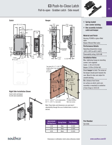 Dimensions in millimeters (inch) unless otherwise stated241www.southco.com/C3ACTUAL SIZEApproximate Pull-Up Force Spring Colour Part Number13 N Blue C3-80322 N Silver C3-80544 N Black C3-81028.2 (1.11)5.1(.20) 14.5 (.57)8(.32)40.6(1.60)Cam5.3(.21)2 x 3.3(.13)2 holes,Ø 3.3 (.13)13.7(.54)3.8(.15)48.3(1.90)2.5 (.1)Spring Two holes Ø 3.3 (.130 ) for M3 or No. 4 sizescrews or Ø 3 rivets+.004- 0 +0.1- 0 40.6(1.60 )+0.3- 0+.012- 00±0.2(0±.008)Centerline of frame holes 15.7 (.618 ) or for adjustability 24.7 (.972 ) (see note)+0.1- 0+.004- 0 +0- 0.3 +0- .012FrameØ4.3 (.169 ) 2 x holes for M4 or No.8 size screws +0.1- 0 +.004- 055±0.5(2.165±.020)Centerline of door holes Door 7(.276 )+0- 0.3+.0- .012Note: These holes and dimensions are used only if adjustability through the use of slotted holes in catch is desired.Right Side Installation ShownInvert catch and keeper for left side installationCatch Keeper4 (.16)4 (.16)55(2.17)Orientationindicator2 x 4.3(.17)23.8(.94)4 (.16)72(2.83)11.5(.45)C3 Push-to-Close LatchPull-to-open · Grabber catch · Side mount • Spring-loaded over-center latching• One assembly includes catch and keeperMaterial and FinishHousing: PC/ABS or glass-filled nylonKeeper: Mineral filled nylonPerformance Details Operating temperature range:-30ºC (-20ºF) to 60ºC (140ºF)Flammability rating: UL94-HBInstallation NotesMax. tightening torque on mounting screws: (not supplied)Catch: 1.1 Nm (9.7inlbf)Keeper: 2.8 Nm (24.8inlbf)Orient keeper to latch. The arrow on the keeper should point towards the cam. Mount to door and adjust for smooth latching.Min. distance from frame(or surface on which catch subassembly is mounted) to centerline of door hinge is 150 (5.9)Part NumberSee table