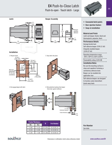 Dimensions in millimeters (inch) unless otherwise statedACTUAL SIZEFrame ThicknessD Part NumberMin. Max.1 (.04) 3 (.12) 0.9 (.035) E4-10-201-103 (.12) 5 (.20) 2.9 (.115) E4-10-202-105 (.20) 7 (.28) 4.9 (.196) E4-10-203-101.3 (.05) 20.5 (.80) 29 (1.15) 13 (.50) D Pressure sensitive adhesive 19 (.75) 9 (.36) 2 (.08) 13 (.50) 11.5±0.1(.450±.005)19±0.1(.750±.005)5.9±0.1(.232±.005)10.3±0.1(.406±.005)0.1(.005)R Max.0.7±0.1(.028±.005)Alternatepreparationfor one wayinstallation1.3 (.05)Overtravel requiredFrame thickness4.8 (.19) LatchInstallationKeeper Assembly1. Prepare frame 2. Snap latch into place3. Re-engage keeper with latch 4. Peel protective backing from keeper Close door against adhesive245www.southco.com/E4E4 Push-to-Close LatchPush-to-open · Touch latch · LargePart NumberSee table• Concealed latch points• Door ejection feature• Snap-in installationMaterial and FinishLatch and keeper: Acetal, black and thermoplastic polyester, blackPerformance DetailsAverage tensile load: Self-adhesive keeper: 50 N (11 lbf)Integrally moulded keeper:120 N (27 lbf)Operating temperature range:-40ºC (-40ºF) to 105ºC (220ºF)Flammability rating: UL94-HBInstallation NotesBe sure the mounting surface is clean and capable of retaining a satisfactory adhesive bond.Keeper can be moulded into application doorSelf-adhesive keepers are designed to function under intermittent break-away loads