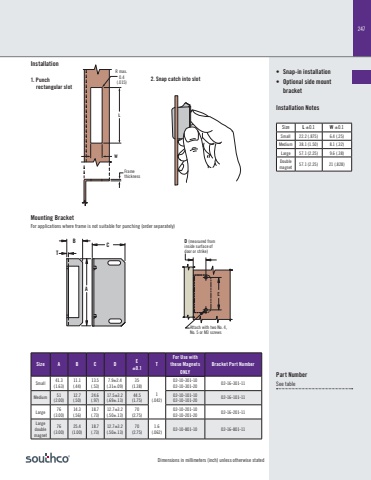 Dimensions in millimeters (inch) unless otherwise stated247Size A B C D E±0.1 TFor Use with these Magnets ONLYBracket Part Number Small 41.3(1.63)11.1(.44)13.5(.53)7.9±2.4(.31±.09)35(1.38)1(.042)02-10-301-1002-10-301-20 02-16-301-11Medium 51(2.00)12.7(.50)24.6(.97)17.5±3.2(.69±.13)44.5(1.75)02-10-101-1002-10-101-20 02-16-101-11Large 76(3.00)14.3(.56)18.7(.73)12.7±3.2(.50±.13)70(2.75)02-10-201-1002-10-201-20 02-16-201-11Large double magnet76(3.00)25.4(1.00)18.7(.73)12.7±3.2(.50±.13)70(2.75)1.6(.062) 02-10-801-10 02-16-801-11D (measured frominside surface ofdoor or strike)Attach with two No. 4, No. 5 or M3 screwsEB TC A LWFrame thicknessR max. 0.4(.015) 1. Punch rectangular slot2. Snap catch into slotMounting BracketFor applications where frame is not suitable for punching (order separately)Installation• Snap-in installation• Optional side mount bracketInstallation NotesPart NumberSee tableSize L ±0.1 W ±0.1Small 22.2 (.875) 6.4 (.25)Medium 38.1 (1.50) 8.1 (.32)Large 57.1 (2.25) 9.6 (.38)Double magnet 57.1 (2.25) 21 (.828)