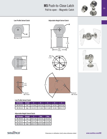 Dimensions in millimeters (inch) unless otherwise stated251www.southco.com/M5Low Profile Swivel Catch Adjustable Height Swivel CatchPart Number Strength A B C D EM5-7N-43-8 Low 37 (1.46) 18.5 (.73) 32 (1.26) 16 (.63) Ø32 (1.26)M5-7N-63-8 High 50 (1.97) 27 (1.06) 46.7 (1.84) 24 (.94) Ø45 (1.77)Low Profile Swivel CatchPart Number Strength E F Min F MaxM5-7N-44-8 Low Ø32 (1.26) 60 (2.36) 89 (3.50)M5-7N-45-8 Low Ø32 (1.26) 75 (2.95) 101 (3.98)M5-7N-65-8 High Ø45 (1.77) 68.5 (2.70) 95 (3.74)Adjustable Height Swivel Catch3X 8-32UNC Thread2X 8-32UNC ThreadM5 Push-to-Close Latch Pull-to-open – Magnetic CatchD ADØECØEB39(1.53)FØ51(2.01)Ø38(1.50)120˚ ±0.1(.003)