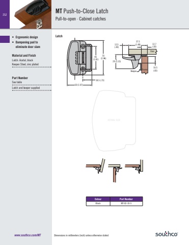 Dimensions in millimeters (inch) unless otherwise stated252www.southco.com/MTACTUAL SIZEColour Part NumberBlack MT-02-10-550 (1.97)70 (2.76) 46 (1.81) 29 (1.15)DoorFrame Keeper12.5(.49)16.5(.65)37.5(1.48) 12.7(.50)18.5 (.73)MT Push-to-Close LatchPull-to-open · Cabinet catchesLatch • Ergonomic design• Dampening pad to eliminate door slamMaterial and FinishLatch: Acetal, black Keeper: Steel, zinc platedPart NumberSee tableLatch and keeper supplied