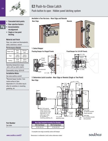 Dimensions in millimeters (inch) unless otherwise stated254www.southco.com/E2ACTUAL SIZE• Concealed latch points• Door ejection feature• Accommodates misalignment• Single or two point latchingMaterial and FinishSteel, zinc plated and thermoplastic, white, aluminium, naturalPerformance DetailsOperating temperature range:-18ºC (-0ºF) to 120ºC (250ºF)Flammability rating: UL94-V0Installation NotesSee www.southco.com/e2*Nominal keeper location from inside surface of door. Adjustable 6.4 (.25) either way to allow for variations in mounting, gasketing, etc Near Edge Complete Assembly Part NumberWith Fixed Keeper With Floating KeeperE2-50-101-10 E2-50-101-20Part NumberSee table14.3 (.56) 5.2 (.203) 25.5 (1.00) 12.7(.50) 20.6 (.81) 41.3 (1.63) 3/8-24 thread 38 (1.50) nominal keeper location frominside surface of door. Adjustable 6.4 (.25)either way to allow for variations in mounting, gasketing, etc.16(.63)25.5(1.00)8 (.312)23.847.6 (.94)(1.88)52.4(2.06)19(.75)4.4 (.17) operating stroke Ø 7.1 (.28)19(.75)28.6(1.13)33.4(1.32)20.9(.82)8(.31)62(2.44)1.5(.06)ActuatorbuttonPanel edge for exposed actuator (finger operated) Panel edgefor concealed actuator(tool operated) 9.5(.38)holeØØ 5.2 (.203) Keeper Latch 38 (1.50)*1.6(.06)20.6(.81)15.6(.62)7.1 (.28)5.2(.203)ReceiverAssemblyLatchActuator66.7(2.63)Adjusting ScrewØØ24(.94)12.7 (.50)2(.08) U-bentwasherStudLockwasherEyelet Length of rod160 - 1372 (6.3 - 54.0)4.4 (.17) Operating stroke (will vary depending upon rod length)Panel edge for exposed actuator (finger operated) Panel edgefor concealed actuator(tool operated)E2 Push-to-Close LatchPush-button to open · Hidden panel latching systemFloating Keeper for Hinged Panels Fixed Keeper for Lift-Off PanelsA complete near edge assembly comes with keeperAvailable in Two Versions - Near Edge and Remote Near Edge Remote1. Select Keeper2. Determine Latch Location - Near Edge or Remote (Single or Two Point)Near EdgeKeeper style Static loadUltimate loadFixed 1300 N(300 lbf)2200 N(500 lbf)Floating 750 N(170 lbf)1400 N(310 lbf)