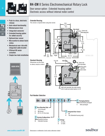 26Dimensions in millimeters (inch) unless otherwise statedACTUAL SIZE• Push-to-close, electronic release• Auto relock functionality• Minimal power draw• Integrated connector• Extended housing option for added security• Optional door sensor• Microswitch to detect latch status• Mechanical over-ride with integrated cable bracket• Effi cient DC motor actuation• Simple two-hole installationR4-EM 8 Series Electromechanical Rotary LockDoor sensor option · Extended housing optionElectronic access without internal motor controlDOOR OPEN1 2 34 5 67 8 9 0 #1 2 34 5 67 8 9Ø 0 #OPEN LATCH39.8(1.57)2.5(.10)20 (.79)Cam closedCam openThis version is required whenusing door sensor.42.5(1.67)18 (.71)66 (2.6)76.5 (3.0)20.5(.81)9.8 (.38)23.4 (.92)77.5(3.05)35.4(1.4)90(3.54)Exposed CamStriker bolt(sold separately)Striker bolt(sold separately)Mounting holes(see PartNumber table)Concealed CamCable sold separately. See cable drawing (J-AC-C cable and conduit options 4 or 5)MechanicaltriggerP Packaging OptionsNone Individually packaged1 Bulk packagedS Integrated Door Sensor3 No4 Yes (Extended housing only)B Base Mounting Style1 1/4-20 thread2 M6 thread3 Ø 7.0 (.27) thru holeA Housing Confi gurationsNone Standard housing6 Extended housingV Voltage2 24 volts3 12 voltsPart Number SelectionExtended HousingThis version is required when using door sensor.Standard Housing(Dimensions are the sameas above, except as noted.)R4 - EM - 8 B A - V S 0 - P12V24Vwww.southco.com/R4-EM