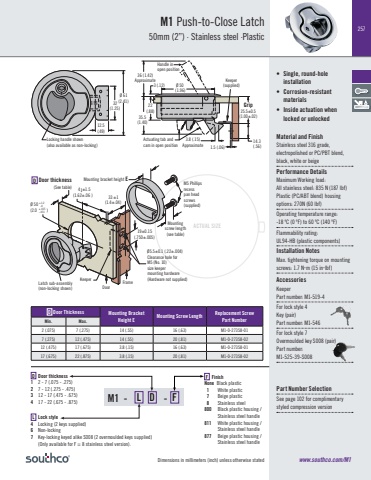 Dimensions in millimeters (inch) unless otherwise stated(.750±.005)19±0.15Ø5.5±0.1 (.22±.004)+1.2-0+.015-.03141 (1.62 ) 33 (1.4±.04)±1.5±1 ±.06Ø 50(2.0 )Ø 61(2.41)12.5(.49)32(1.25) 25.5±0.5(1.00±.02)3.8 (.15) 14.3(.56)35.5(1.40)22(.88)3 (.12)1.5 (.06)Ø 50 (1.96)36 (1.42)M1 - L D - FD Door Thickness Mounting Bracket Height E Mounting Screw Length Replacement Screw Min. Max. Part Number2 (.075) 7 (.275) 14 (.55) 16 (.63) M1-0-27358-017 (.275) 12 (.475) 14 (.55) 20 (.81) M1-0-27358-0212 (.475) 17 (.675) 3.8 (.15) 16 (.63) M1-0-27358-0117 (.675) 22 (.875) 3.8 (.15) 20 (.81) M1-0-27358-02Keeper(supplied)Handle in open positionApproximateApproximateActuating tab andcam in open positionLocking handle shown(also available as non-locking)Mounting bracket height E(See table) M5 Phillips recesspan head screws (supplied)Mounting screw length(see table)FrameDoorKeeper Latch sub-assembly (non-locking shown)Door thicknessACTUAL SIZEDClearance hole forM5 (No. 10)size keepermounting hardware(Hardware not supplied)Gripwww.southco.com/M1• Single, round-hole installation• Corrosion-resistant materials• Inside actuation when locked or unlockedMaterial and FinishStainless steel 316 grade,electropolished or PC/PBT blend,black, white or beigePerformance DetailsMaximum Working load:All stainless steel: 835 N (187 lbf)Plastic (PC/ABT blend) housing options: 270N (60 lbf)Operating temperature range:-18 ºC (0 ºF) to 60 ºC (140 ºF)Flammability rating:UL94-HB (plastic components)Installation NotesMax. tightening torque on mounting screws: 1.7 Nm (15 inlbf)AccessoriesKeeper Part number: M1-519-4For lock style 4Key (pair)Part number: M1-546For lock style 7Overmoulded key S008 (pair)Part number: M1-525-39-S008Part Number SelectionSee page 102 for complimentary styled compression versionD Door thickness1 2 - 7 (.075 - .275)2 7 - 12 (.275 - .475)3 12 - 17 (.475 - .675)4 17 - 22 (.675 - .875)L Lock style4 Locking (2 keys supplied) 6 Non-locking7 Key-locking keyed alike S008 (2 overmoulded keys supplied) (Only available for F = 8 stainless steel version).F FinishNone Black plastic 1 White plastic 7 Beige plastic 8 Stainless steel800 Black plastic housing /Stainless steel handle811 White plastic housing /Stainless steel handle877 Beige plastic housing /Stainless steel handleM1 Push-to-Close Latch50mm (2”) · Stainless steel ·Plastic257