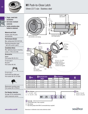 Dimensions in millimeters (inch) unless otherwise stated258www.southco.com/M1ACTUAL SIZEM1 - 25 - L D - G 8(.750±.005)KeeperLatchSub-assembly(non-locking shown)19±0.15M5 Phillipsrecesspan headscrews(supplied)Ø 5.5±0.1 (.22±.004)Clearance hole for M5 (No. 10) size keeper mounting hardware(hardware not supplied)Mounting bracket heightDoorthicknessDEBØ 63.5±.05(2.5±.02)DoorFrame52.5 ±1.5(2.07±.06) G Grip E Mounting Bracket HeightD Door Thickness BMin. Max.20±0.5 (.75±.02) 22 (.875) 2 (.075) 12 (.475) 27 (1.10)32±0.5 (1.25±.02) 22 (.875) 2 (.075) 12 (.475) 39 (1.54)20±0.5 (.75±.02) 12 (.475) 12 (.475) 22 (.875) 27 (1.10)32±0.5 (1.25±.02) 12 (.475) 12 (.475) 22 (.875) 39 (1.54)D Door thickness1 2 - 12 (.075 - .475) 2 12 - 22 (.475 - .875)L Lock style4 Locking keyed alike (2 keys supplied) 6 Non-locking7 Key-locking keyed alike S008 (2 overmoulded keys supplied)G Grip1 20±0.5 (.75±.02)2 32±0.5 (1.25±.02)GripActuating tab andcam in open position22(.88)3(.12)39.5(1.55)44.5(1.75)Ø 63 (2.5)Handle inopen position Ø 76(3.0)Locking handle shown(also available as non-locking)Keeper(Supplied)GM1 Push-to-Close Latch64mm (2.5”) size · Stainless steel• Single, round-hole installation• Corrosion-resistant materials• Inside actuation when locked or unlockedMaterial and FinishStainless steel 316 grade,electropolishedPerformance DetailsMax. working load: 835 N (187 lbf)Operating temperature range: -18ºC (0ºF) to 60ºC (140ºF)Installation NotesMax. tightening torque on mounting screws: 1.7 Nm (15 inlbf)AccessoriesKeeper Part number: M1-525-19-4For lock style 4 Key (pair)Part number: M1-546For lock style 7Overmoulded key S008 (pair)Part number: M1-525-39-S008Replacement mounting screwPart number: M1-0-27358-02Part Number SelectionSee page 103 for complimentary styled compression version