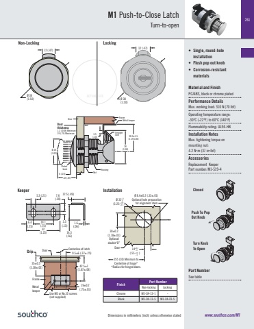 Dimensions in millimeters (inch) unless otherwise stated19.1(.75)6.4(.25)32(1.25)7.6(.30)5.3 (.21)3.3(.13)14.3(.56)1.6(.O6)12.5 (.49)ACTUAL SIZEwww.southco.com/M1FinishPart Number Non-locking LockingChrome M1-2A-13-1 -Black M1-2A-13-5 M1-2A-23-5NutHousing38(1.50)Metal keeperFrame30.3±1.5 (1.19±.06)DoorØ 38 (1.50)12 (.47)3.5(.14)StraightcamDoorthickness1.2 (.048) Minimum to 19 (.75) Maximum FlutedknobØ 26(1.02)6 (.24)22 (.87)Grip35±0.5(1.38±.02)Metalkeeper42.5±1(1.67±.04)19±0.2(.75±.01)Use M5 or No.10 screws(not supplied)Centerline of latch9.5±6 (.37±.25)FrameDoorDoorØ 8.4±0.2 (.33±.01) Optional hole preparationfor alignment stem30±0.2(1.18±.01)Optionaldouble“D”Ø 32 (1.25 )+2-0+.03 -.01 14 (.55 ) +0.2- 0+.01- 0255 (10) Minimum toCenterline of hinge**Radius for hinged doors.Push To Pop Out KnobTurn Knob To OpenClosedNutHousing38(1.50)Metal keeperFrame30.3±1.5 (1.19±.06)DoorØ 38 (1.50)12 (.47)3.5(.14)StraightcamDoor thickness1.2 (.048) Minimum to 19 (.75) Maximum FlutedknobØ 26(1.02)6 (.24)22 (.87)Ø 38 (1.50)12 (.47)261Keeper InstallationM1 Push-to-Close LatchTurn-to-open • Single, round-hole installation• Flush pop out knob• Corrosion-resistant materialsMaterial and FinishPC/ABS, black or chrome platedPerformance DetailsMax. working load: 310 N (70 lbf)Operating temperature range:-30ºC (-22ºF) to 60ºC (140ºF)Flammability rating: UL94-HBInstallation NotesMax. tightening torque on mounting nut: 4.2 Nm (37 inlbf)AccessoriesReplacement KeeperPart number: M1-519-4 Part NumberSee tableNon-Locking Locking