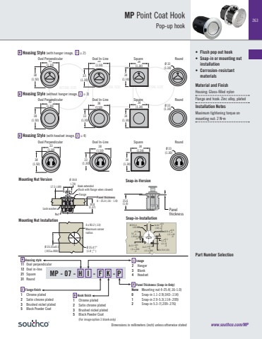 Dimensions in millimeters (inch) unless otherwise stated263www.southco.com/MPPart Number SelectionACTUAL SIZE ACTUAL SIZE ACTUAL SIZE Ø 18.8(.74)17.5 (.69)34.8(1.37)Panel thickness4 - 25.4 (.16 - 1.0)Lock washer33(1.30)38(1.50)33(1.30)38(1.50)Oval Perpendicular Oval In-Line Square34(1.34)34(1.34)Hook extended(flush with flange when stowed)FlangeRoundØ 33(1.30)Nut33(1.30)38(1.50)33(1.30)38(1.50)34(1.34)34(1.34)Ø 33(1.30)33(1.30)38(1.50)33(1.30)38(1.50)34(1.34)34(1.34)Ø 33(1.30)Ø 18.8(.74)17.5 (.69)34.8(1.37)Panel thickness4 - 25.4 (.16 - 1.0)Lock washer33(1.30)38(1.50)33(1.30)38(1.50)Oval Perpendicular Oval In-Line Square34(1.34)34(1.34)Hook extended(flush with flange when stowed)FlangeRoundØ 33(1.30)Nut33(1.30)38(1.50)33(1.30)38(1.50)34(1.34)34(1.34)Ø 33(1.30)33(1.30)38(1.50)33(1.30)38(1.50)34(1.34)34(1.34)Ø 33(1.30)H Housing Style (with hanger image, I = 2)H Housing Style (without hanger image, I = 3)• Flush pop out hook• Snap-in or mounting nut installation• Corrosion-resistant materialsMaterial and FinishHousing: Glass-filled nylonFlange and hook: Zinc alloy, platedInstallation NotesMaximum tightening torque on mounting nut: 2 NmOval Perpendicular Oval In-Line Square RoundOval Perpendicular Oval In-Line Square RoundOval Perpendicular Oval In-Line Square RoundMP - 07 - H I - F K -PH Housing style11 Oval perpendicular12 Oval in-line 21 Square31 RoundK Hook finish1 Chrome plated2 Satin chrome plated3 Brushed nickel plated5 Black Powder Coat (For image option 3 blank only)P Panel Thickness (Snap-in-Only)None Mounting nut 4-25.4(.16-1.0)0 Snap-in 1.1-2.9(.043-.114)1 Snap-in 2.9-5.3(.114-.209)2 Snap-in 5.3-7(.209-.276)F Flange finish1 Chrome plated2 Satin chrome plated3 Brushed nickel plated5 Black Powder Coat I Image2 Hanger3 Blank 4 HeadsetMP Point Coat HookPop-up hookØ 18.8(.74)17.5 (.69)34.8(1.37)Panel thickness4 - 25.4 (.16 - 1.0)Lock washer33(1.30)38(1.50)33(1.30)38(1.50)Oval Perpendicular Oval In-Line Square34(1.34)34(1.34)Hook extended(flush with flange when stowed)FlangeRoundØ 33(1.30)Nut33(1.30)38(1.50)33(1.30)38(1.50)34(1.34)34(1.34)Ø 33(1.30)33(1.30)38(1.50)33(1.30)38(1.50)34(1.34)34(1.34)Ø 33(1.30)H Housing Style (with headset image, I = 4)Ø 18.8(.74)17.5 (.69)34.8(1.37)Panel thickness4 - 25.4 (.16 - 1.0)Lock washer33(1.30)38(1.50)33(1.30)38(1.50)Oval Perpendicular Oval In-Line Square34(1.34)34(1.34)Hook extended(flush with flange when stowed)FlangeRoundØ 33(1.30)Nut33(1.30)38(1.50)33(1.30)38(1.50)34(1.34)34(1.34)Ø 33(1.30)33(1.30)38(1.50)33(1.30)38(1.50)34(1.34)34(1.34)Ø 33(1.30)Ø 23.25±0.1 (.915±.004)Ø 25.4 (1.0 )+0.8-0+.03-04 x R3.2 (.13)Maximum cornerradiusMounting Nut Version Snap-in-VersionPanel thicknessMounting Nut Installation Snap-in-Installation35.6(1.4)2x 8.2Ø 25.48X R 0.4 (.02) MIN3.2+0.1 - 0 (.13)+0 - 02x 2.72x 15.4 (.61)2x 2.5 (.1) +.004 - 0 (.1) +.004 - 0+0.1 - 0 +0.1 - 05.2(.2) +0 - 0+0.1 - 0(.1) +.02 - 0(.32) +0 - 0 +0.6- 0+0.1- 0