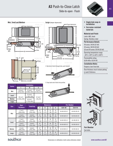 Dimensions in millimeters (inch) unless otherwise statedACTUAL SIZESmallACTUAL SIZEMediumD2 (.08)SpringFinger depressionSlideCTotalgripDoorthicknessFrameDoorB15 (.58) 13 (.50)AXMaximum R0.2 (.010) FrameDoorLWSeriesInstallationL W XMini 22.0±0.1(.870±.005)22.4±0.1(0.808±.005)8.5±0.7(0.330±.027)Small38.1±0.1(1.500±.005)25.4±0.1(1.000±.005) 12.7±0.7 Medium (.50±.03) 44.5±0.1(1.750±.005) LargeACTUAL SIZELarge2 (.08)SlideFinger depressionC DLatch travel6.4 (.25)TotalgripFrameDoorthicknessDoorSpringB21(.81)19(.74)AMini, Small and Medium Large (deeper depression)1. Slip front of latch through hole, push forward2. Snap back end of latch into positionSize DoorThickness Total GripDimensions Part NumberA B C D UL94-HB UL94-VOMini1.3±0.1(.050±.005)6.4±0.1(.250±.005)31 (1.21)35 (1.37)25 (.98)22 (.87) A3-90-525-12 A3-90-525-251.5±0.1(.060±.005)6.4±0.1(.250±.005)31 (1.21)35 (1.37)25 (.98)22 (.87) A3-90-625-12 A3-90-625-25Small1.3±0.1 (.050±.005)6.4±0.1 (.250±.005)47 (1.84)57 (2.23)28 (1.11)25 (.99) A3-40-525-12 A3-99-187-121.6±0.1(.060±.005)6.4±0.1(.250±.005) 47 (1.84)57 (2.23)28 (1.11)25 (.99) A3-40-625-12 A3-99-130-12Medium 2.2±0.1(.090±.005)6.4±0.1 (.250±.005)47 (1.84)57 (2.23)48 (1.87)44 (1.74) A3-50-925-12 A3-99-144-12Large 2.2±0.1(.090±.005)6.4±0.1 (.250±.005)48 (1.87)57 (2.23)50 (1.95)44 (1.74) A3-99-122-12 A3-99-253-01265www.southco.com/A3A3 Push-to-Close LatchSlide-to-open · Flush • Single hole snap-in installation• Corrosion-resistant materialsMaterial and FinishLatch: ABS, blackSpring: Stainless steelPerformance Details90 series 140 N (32 lbf)40 series 180 N (40 lbf)50 and 99 series 220 N (50 lbf)Operating temperature range: -40ºC (-40ºF) to 60ºC (140ºF)Flammability rating: UL94-HB or UL94-V0Installation NotesPrepare a burr free holeDoor thickness must include plating or paint thicknessPart NumberSee table