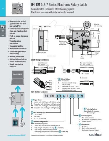 28www.southco.com/R4-EM Dimensions in millimeters (inch) unless otherwise statedR4 - EM - T B A -1 S C - P M53.8 (2.12) 140 (5.5)minimum 69.5 (2.74)20.9 (.82)9.6 (.38)2.5 (.10)15.0(.59)42.5(1.67)Striker bolt(sold separately)Cam69.3(2.73)12.5 (.49)Mounting holes(See Part Number table)Mechanicaltrigger18.0 (.71)16.09.5 (.37) (.63)5.9 (.23)12.15 (.48)6.0 (.24)11.4 (.45) 430 (16.9)Pin 4Pin 5Pin 6Pin 3Pin 2Pin 1Pin 6Pin 5Pin 4Pin 1Pin 2Pin 3Ø3.28 (.129) accessory mounting holes x 2 Max. insertion depth 5mmØ3.28 (.129) accesory mounting holes x 2 Max. insertion depth 5mm16.09.5 (.37) (.63)5.9 (.23)12.15 (.48)5.9 (.23)Mechanical triggerMechanical over-ride cable mounting bracket kit for rear trigger latch (R4-EM-87).(See page XXX)3 (.12) 39.68 (1.56)16.76 (.66)12.7 (.50) HexØ 25.4 (1.00) Ø 9.5(.37)7.5(.30)WasherO-RingM8 x 1.25Thread38.1(1.50)27.7(1.09)25.4(1.00) 2.8(0.11)20.7(.816)ACTUAL SIZENo ConnectorNon-sealed ConnectorMolex Microfit 3.0 seriesSealed ConnectorMolex MX150 seriesPart Number SelectionP Packaging OptionsNone Individually packaged1 Bulk packagedC Connector Options1 Non-sealed connector2 No connector (stripped and tinned)3 Sealed connectorS Switch Options3 No switch6 Single switch (cam only)7 Dual switch (Cam and Trigger)A Alternate ConfigurationsNone Standard configuration2 Strong (kick out) cam spring (delayed relock)3 High strength cam (steel cam only) M = none only4 High strength cam with strong (kick out)cam spring (delayed relock, steel cam only) M = none onlyB Base Mounting Style1 1/4-20 thread2 M6 thread3 Ø 7.0 (.27) thru holeT Trigger Style5 Auto re-lock, side trigger, with kick-out spring7 Delayed re-lock, side trigger, with light springR5 Auto re-lock, rear trigger, with kick-out springR7 Delayed re-lock, rear trigger, with light springM Material OptionsNone Steel platedB Stainless steel (Alt Confignone or 2 only)C Steel plated, UL, class 1 Div 2D Stainless steel, UL class 1 Div 2 (Alt Config none or 2 only)160 (6.3)11 2 3PIN 3PIN 2PIN 1PIN 1 IndicatorPIN 6PIN 5PIN 4 400 (15.7)160 (6.3)11 2 3PIN 3PIN 2PIN 1PIN 1 IndicatorPIN 6PIN 5PIN 4 400 (15.7)Latch Wiring Connections53.8 (2.12) 140 (5.5)minimum 69.5 (2.74)20.9 (.82)9.6 (.38)2.5 (.10)15.0(.59)42.5(1.67)Striker bolt(sold separately)Cam69.3(2.73)12.5 (.49)Mounting holes(See Part Number table)Mechanicaltrigger18.0 (.71)16.09.5 (.37) (.63)5.9 (.23)12.15 (.48)6.0 (.24)11.4 (.45) 430 (16.9)Pin 4Pin 5Pin 6Pin 3Pin 2Pin 1Pin 6Pin 5Pin 4Pin 1Pin 2Pin 3Ø3.28 (.129) accessory mounting holes x 2 Max. insertion depth 5mmØ3.28 (.129) accesory mounting holes x 2 Max. insertion depth 5mm16.09.5 (.37) (.63)5.9 (.23)12.15 (.48)5.9 (.23)Mechanical triggerMechanical over-ride cable mounting bracket kit for rear trigger latch (R4-EM-87).(See page XXX)3 (.12) 39.68 (1.56)16.76 (.66)12.7 (.50) HexØ 25.4 (1.00) Ø 9.5(.37)7.5(.30)WasherO-RingM8 x 1.25Thread38.1(1.50)27.7(1.09)25.4(1.00) 2.8(0.11)20.7(.816)R4-EM 5 & 7 Series Electronic Rotary LatchSealed motor · Stainless steel housing optionElectronic access with internal motor control• Motor actuator sealed against water and dust ingress to IP56• Corrosion resistant platedsteel and stainless steel options• Push-to-close, electronic release• Versatile rotary mechanism• Concealed latching• Microprocessor control• Auto or delayed relock functionality• Minimal power draw• Optional internal microswitch for latch status• Simple mechanical over-ride12V24VDOOR OPEN1 2 34 5 67 8 9 0 #