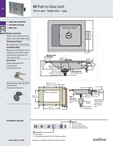 Dimensions in millimeters (inch) unless otherwise stated282ACTUAL SIZE64 - 10 - 30 L - M 0www.southco.com/64Gap important(See installation notes)FrameDoorMounting bracketAdjusting nutLockwasherMounting nut127 (5.0)28.5(1.13)101.5(4)11(.44)Available with or without lock (see part number selection)11.9(.47)1.6(.06)4.5 (.17)1/4-20 Thread49(1.94)25.5(1.01)Maximum door thickness9.5 (.38)R 3 (.13) MaximumDoor FrameMinimum 11 (.44)Maximum 15.9 (.63)82.5(3.25±.01)+0.3- 0.2108(4.25±.01)+0.2- 0.3Gapimportant(see installation notes)Edge of frame ormodified latchingsurface (notch,hole, bracket orshim)14.3 (.56) MinAdjusting nutMountingbracketLockwasherMounting nutSlideFrame11.9 (.47) 20.6 (.81) RefPart Number Selection64 Push-to-Close LatchPull-to-open · Paddle latch · Large• Single hole installation• Concealed mounting• Metal slideMaterial and FinishStainless steel, brushed, steel, zinc plated or steel, black powder coatedPerformance DetailsMax. working load: 1110 N (250 lbf)Installation NotesMeasure your door thickness and setadjusting nut so that GAP is equal to door thickness within plus 0.8 (.03), minus 0.0 (.00)AccessoriesFlat key, keyed alike CH751 (2 keys per ring)Part number: PK-10-01Overmoulded key, keyed alike CH751 (2 keys per ring)Part number: PK-10-01-05L Lock style1 Non-locking2 Key-locking keyed alike CH751 (2 Flat keys supplied)M Material4 Steel, zinc plated 5 Stainless steel brushed9 Steel, black powder coated