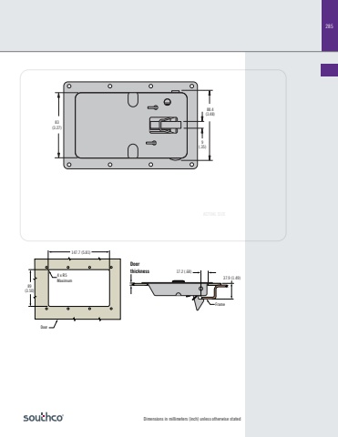Dimensions in millimeters (inch) unless otherwise stated285ACTUAL SIZEFrame37.9 (1.49)17.2 (.68)Door thickness147.7 (5.81)89(3.50)Door4 x R5MaximumH83(3.27)88.4(3.48)9(.35)5.3 (.21)52(2.05)110(4.33)170 (6.7)7 (.28) 5 (.20)100(3.94)52(2.05)52(2.05)8 x Ø rivet mounting latches onlyAvailable with or without lock (see part number selection)