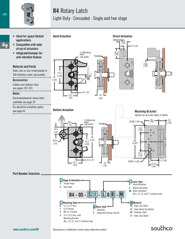 290Dimensions in millimeters (inch) unless otherwise statedACTUAL SIZEwww.southco.com/R4R4 Rotary LatchLight-Duty · Concealed · Single and two stage• Ideal for space limited applications• Compatible with wide array of actuators• Integrated bumper for anti-vibration featureMaterial and FinishSteel, zinc or zinc nickel plated or304 stainless steel, passivatedAccessoriesCables and retainer clips see pages 322-323NotesElectromechanical rotary latch available see page 20 For electrical actuation optionsee page 42Hand ActuationR4 - 05 - S I - L 0 B - MS Stage & Actuation 2 Single stage4 Two stageL Lever Type 4 Hand Actuation5 Bottom Actuation9A Direct Actuation (M = 10, 15, and 77 material only)M Material 10 Steel, Zinc Plate15 Steel, Black Zinc Nickel20 Stainless Steel77 Steel, Zinc NickelB Base style 1 Standard5 Integrated bumper versionI Mounting Style0 4.5 (.177) thru1 8-32 thread2 M4 x 0.7 thread3 4.5 (.177) thru withMounting Bracket(M = 10, 15, and 77 material only)21.2 (.83)9.4 (.37)25.4 (1.00) 46(1.81) 12.7 (.5)10(.39)Panel2 x Mounting holes(see table)ReleaseBottom ActuationDirect Actuation(Steel Only)21.2 (.83)9.4 (.37)25.4 (1.00)46(1.81)10.9(.43)Ø6.4(.25)18.5(.73)10(.39)Panel2 x Mounting holes(see table)Part Number Selection12.7(.50)11 (.43)12.7(.50)13.75(.54)3X Ø6.5 (.26)46(1.81)2X R6 (.24) 10(.39)20(.79)12.4(.49)5.3 (.21)11.5(.45)14.9(.59)12.7(.50)11 (.43)12.7(.50)13.75(.54)3X Ø6.5 (.26)46(1.81)2X R6 (.24) 10(.39)20(.79)12.4(.49)5.3 (.21)11.5(.45)14.9(.59)Mounting Bracket(Option for all Lever Types in Steel)