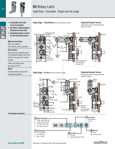 292Dimensions in millimeters (inch) unless otherwise statedR4 - 10 - S I - L 0 B - MACTUAL SIZEACTUAL SIZETriggerPull direction3.5 (.14)68.5 (2.70)Striker bolt assembly(sold separately)(see page 259) 14.2 (.56)6.5 (.26)2 x Ø 6 (.24) Ø 14 (.55)17.8(.70)28.4(1.12)Lever2 x Mounting holes(see table)Housing3.5(.14)11(.43)12.5(.49)2(.08)28 (1.1)13.5 (.53)15.6 (.61)22.5 (.88)CamPanelPull direction3.5 (.14)68.5 (2.70)Striker bolt assembly(sold separately)(see page 259)14.2 (.56)6.5 (.26)Spring Ø 6 Lever(.24)Ø 14(.55) 28.4(1.12)2 x Mounting holes(see table)Housing3.5(.14)11(.43) Trigger28 (1.1)15.6(.61)22.5 (.88)Cam13.5 (.53)PanelR4 Rotary LatchLight-Duty · Concealed · Single and two stagewww.southco.com/R4Single Stage - Perpendicular (left hand actuation shown)Single Stage - In-Line (left hand actuation shown)• Compatible with wide array of actuators• EN 45545-3 E60 Compliant(Standard version only)• Integrated bumper versionfor anti-vibration featureMaterial and FinishSteel, zinc plated or 304 stainless steel, passivatedAccessoriesStriker bolts for standard version and integrated bumper version are different. See page 297 for both versions.Cables and retainer clips see pages 322-323NotesElectromechanical rotary latch available see page 2020(.79)PanelB2X Ø 6.3(.25)20(.79)PanelB Base Style1 Standard5 Integrated bumper versionS Stage & Actuation 1 Single stage, right hand2 Single stage, left hand3 Two stage, right hand4 Two stage, left handL Lever Type 1 Perpendicular2 In-LineM Material 10 Steel20 Stainless steelI Mounting Style0 Ø7.2 (.283) thru1 1/4-20 thread2 M6 x 1 threadPart Number Selection _______________________________________________________________________________Integrated Bumper Version(dimensions same as standard version except as shown)Integrated Bumper Version(dimensions same as standard versionexcept as shown)