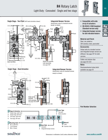293Dimensions in millimeters (inch) unless otherwise statedACTUAL SIZEACTUAL SIZESingle Stage - Two Point (left hand actuation shown)Single Stage - Hand Actuation Pull direction2 x Mountingholes (see table)Housing3.5 (.14)11 (.43)Trigger13.5 (.53) 28 (1.1)Cam15.6 (.61)22.5 (.88)16 (.63)Striker bolt assembly(sold separately)(see page 259)14.2 (.56)3.5(.14)Spring68.5(2.70)4 (.16)Panelwww.southco.com/R4• Compatible with wide array of actuators• EN 45545-3 E60 Compliant(Standard version only)• Integrated bumper versionfor anti-vibration featureMaterial and FinishSteel, zinc plated or304 stainless steel, passivatedAccessoriesStriker bolts for standard version and integrated bumper version are different. See page 297 for both versions.Cables and retainer clips see page 322-323NotesElectromechanical rotary latch available see page 20R4 Rotary LatchLight-Duty · Concealed · Single and two stageØ 5.5(.22)Ø 6.3(.25)20(.79)Panel20(.79)R4 - 10 - S I - L 0 B - MB Base Style1 Standard5 Integrated bumper versionS Stage & Actuation 1 Single stage, right hand2 Single stage, left hand3 Two stage, right hand4 Two stage, left handL Lever Type 3 Two point4 Hand actuationM Material 10 Steel20 Stainless steelI Mounting Style0 Ø7.2 (.283) thru1 1/4-20 thread2 M6 x 1 thread___________________________________________________________________________ Part Number SelectionIntegrated Bumper Version(dimensions same as standard version except as shown)Integrated Bumper Version (dimensions same as standard versionexcept as shown)Panel Pull direction Pull directionHousing3.5(.14)11(.43)12.5 (.49) 2 (.08)Trigger28 (1.1)15.6(.61)22.5(.88)CamStriker bolt assembly (sold separately)(see page 259)Spring2 x Mounting holes (see table)3.5 (.14)68.5 (2.70)14.2 (.56)6.5 (.26)2 x Ø 14 (.55)14 (.55)17.5(.69)28(1.10)LeverØ 6.3 (.25)Ø 5.5 (.22)10.5(.41) 28(1.10)13.5 (.53)