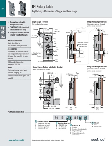 294Dimensions in millimeters (inch) unless otherwise statedACTUAL SIZE1.5 Minimum(.06)Panel18.4(.72)30.6 (1.56)14.9(.59)22.5(.88)11(.43)15.6(.61)3.5(.14)13.5 (.53)48 (1.89)80.2 (3.16)19.9 (.78)Panel1.5 Minimum(.06)4(.16) 3.4(.13)Panel19.9(.78)PanelPull directionPull directionStriker bolt assembly(sold separately)(see page 259)14.2 (.56)Spring68.5(2.70)4 (.15)Housing3.5(.14)11 (.43)Trigger13.5(.53) 28 (1.1)Cam15.6(.61)22.5(.88)Ø 6.4±0.1 (.25±.009)15.5±1(.61±.04)39.2±.1(1.54±.04)2 x Mounting holes(see table)R4 Rotary LatchLight-Duty · Concealed · Single and two stagewww.southco.com/R4Single Stage - Bottom (left hand actuation shown)• Compatible with wide array of actuators• EN 45545-3 E60 Compliant(Standard version only)• Integrated bumper versionfor anti-vibration featureMaterial and FinishSteel, zinc plated or304 stainless steel, passivatedAccessoriesStriker bolts for standard version and integrated bumper version are different. See page 297 for both versions.Cables and retainer clips see pages 322-323NotesElectromechanical rotary latch available see page 20For electrical actuation option see page 43Part Number Selection _______________________________________________________________________________Integrated Bumper Version(dimensions same as standard version except as shown)Integrated Bumper Version(dimensions same as standard version except as shown)Single Stage - Bottom with Cable Bracket(Right hand actuation shown)R4 - 10 - S I - 5 0 B - MB Base Style1 Standard2 Standard with cable bracket5 Integrated bumper6 Integrated bumper with cable bracketS Stage & Actuation 1 Single stage, right hand2 Single stage, left hand3 Two stage, right hand4 Two stage, left handM Material 10 Steel20 Stainless steelI Mounting Style0 Ø7.2 (.283) thru1 1/4-20 thread2 M6 x 1 thread