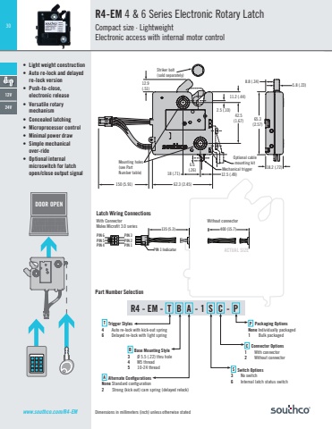 30Dimensions in millimeters (inch) unless otherwise stated135 (5.3)11 2 3PIN 3PIN 2PIN 1PIN 1 IndicatorPIN 6PIN 5PIN 4 400 (15.7)R4 - EM - T B A - 1 S C - PPart Number SelectionA Alternate Confi gurationsNone Standard confi guration2 Strong (kick out) cam spring (delayed relock)ACTUAL SIZEDOOR OPEN1 2 34 5 67 8 90 #• Light weight construction• Auto re-lock and delayed re-lock version• Push-to-close, electronic release• Versatile rotary mechanism• Concealed latching • Microprocessor control• Minimal power draw• Simple mechanical over-ride• Optional internal microswitch for latch open/close output signalR4-EM 4 & 6 Series Electronic Rotary LatchCompact size · LightweightElectronic access with internal motor control2.5 (.10)12.9(.51)11.2 (.44)42.5(1.67)8.8 (.34)5.8 (.23)65.3(2.57)6.6(.26)Ø 3.4 (.13)18.2 (.72)18 (.71)62.3 (2.45)12.5 (.49)150 (5.91)Mounting holes(see Part Number table) Mechanical triggerOptional cablemounting kitStriker bolt(sold separately)3 (.12) 39.68 (1.56)16.8 (.66)16(.63)12.5(.49)150 (5.9)11 2 3PIN 3PIN 2PIN 1 PIN 1 IndicatorPIN 6PIN 5PIN 435.0(1.38)Ø 7.5(.295)24(.95)M6thread2.8(.11)10 (.39)HexLatch Wiring ConnectionsWith ConnectorMolex Microfi t 3.0 seriesB Base Mounting Style3 Ø 5.5 (.22) thru hole4 M5 thread5 10-24 thread135 (5.3)11 2 3PIN 3PIN 2PIN 1PIN 1 IndicatorPIN 6PIN 5PIN 4 400 (15.7)Without connectorP Packaging OptionsNone Individually packaged1 Bulk packagedT Trigger Styles4 Auto re-lock with kick-out spring6 Delayed re-lock with light springS Switch Options3 No switch6 Internal latch status switchC Connector Options1 With connector2 Without connector12V24Vwww.southco.com/R4-EM