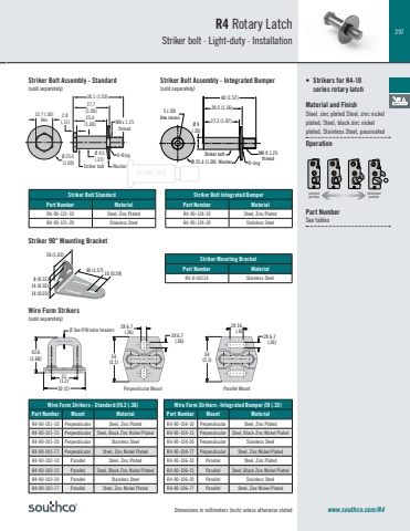 297Dimensions in millimeters (inch) unless otherwise stated www.southco.com/R4R4 Rotary LatchStriker bolt · Light-duty · Installation• Strikers for R4-10 series rotary latchMaterial and FinishSteel, zinc plated Steel, zinc nickel plated, Steel, black zinc nickel plated, Stainless Steel, passivatedOperationLatchedposition UnlatchedpositionPart NumberSee tablesACTUAL SIZEStriker Bolt StandardPart Number MaterialR4-90-121-10 Steel, Zinc PlatedR4-90-121-20 Stainless SteelWire Form Strikers - Standard Ø9.2 (.36)Part Number Mount MaterialR4-90-101-10 Perpendicular Steel, Zinc PlatedR4-90-101-15 Perpendicular Steel, Black Zinc Nickel PlatedR4-90-101-20 Perpendicular Stainless SteelR4-90-101-77 Perpendicular Steel, Zinc Nickel PlatedR4-90-102-10 Parallel Steel, Zinc PlatedR4-90-102-15 Parallel Steel, Black Zinc Nickel PlatedR4-90-102-20 Parallel Stainless SteelR4-90-102-77 Parallel Steel, Zinc Nickel PlatedWire Form Strikers -Integrated Bumper Ø9 (.35)Part Number Mount MaterialR4-90-104-10 Perpendicular Steel, Zinc PlatedR4-90-104-15 Perpendicular Steel, Black Zinc Nickel PlatedR4-90-104-20 Perpendicular Stainless SteelR4-90-104-77 Perpendicular Steel, Zinc Nickel PlatedR4-90-106-10 Parallel Steel, Zinc PlatedR4-90-106-15 Parallel Steel, Black Zinc Nickel PlatedR4-90-106-20 Parallel Stainless SteelR4-90-106-77 Parallel Steel, Zinc Nickel PlatedStriker Bolt Integrated BumperPart Number MaterialR4-90-124-10 Steel, Zinc PlatedR4-90-124-20 Stainless SteelStriker Mounting BracketPart Number MaterialR4-0-50114 Stainless Steel26 (1.02)40 (1.57) 10 (0.39)14 (0.55)14 (0.55)8 (0.31)12.7 (.50)HexØ 25.4 (1.00)Ø 9.5(.37)WasherO-RingM8 x 1.25thread38.1 (1.50)27.7(1.09)25.4(1.00)2.8 (.11)Striker boltStriker Bolt Assembly - Standard (sold separately)Striker Bolt Assembly - Integrated Bumper(sold separately)Striker 90° Mounting BracketØ 25.4 (1.00)40 (1.57)Ø 9(.35)Striker boltWasherM8 X 1.25thread O-ring29.5 (1.16)27.3 (1.07)5 (.20) Hex recessWire Form Strikers(sold separately)Ø 9.2 (.36)42.6(1.68)31(1.2)54(2.1)54(2.1)2X 6.7(.26) 2X 6.7(.26)2X 6.7(.26)2X 16(.6)50 (2) Perpendicular Mount Parallel MountØ See P/N table headers