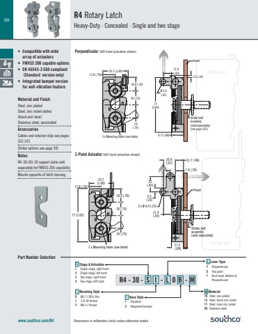 300www.southco.com/R4 Dimensions in millimeters (inch) unless otherwise statedR4 Rotary LatchHeavy-Duty · Concealed · Single and two stage• Compatible with wide array of actuators• FMVSS 206 capable options• EN 45545-3 E60 compliant (Standard version only)• Integrated bumper versionfor anti-vibration featureMaterial and FinishSteel, zinc platedSteel, zinc nickel plated(black and clear)Stainless steel, passivatedAccessoriesCables and retainer clips see pages 322-323Striker options see page 301NotesR4-38-101-10 support plate sold separately for FMVSS 206 capabilityMounts opposite of latch housing.ACTUAL SIZEPanelPull directionStriker boltassembly(sold separately)(see page 261)77(3.03)Ø 6.4(.25)11.4 (.45)17.2 (.68)19.4 (.76)19(.75)2 x Mounting holes (see table)19 (.75)17.8 (.70)35.7 (1.40)3.5 (.14)Perpendicular (left hand actuation shown)R4 - 30 - S I - L 0 B - MS Stage & Actuation 1 Single stage, right hand2 Single stage, left hand3 Two stage, right hand4 Two stage, left handL Lever Type 1 Perpendicular3 Two point7 Dual Lever, Bottom & PerpendicularM Material 10 Steel, zinc plated15 Steel, black zinc nickel 77 Steel, clear zinc nickel20 Stainless steelI Mounting Style0 Ø6.7 (.283) thru1 1/4-20 thread2 M6 x 1 thread1 Base Style1 Standard5 Integrated bumperPart Number SelectionACTUAL SIZE77 (3.03)19.4 (.76)19 (.75)2 x Mounting holes (see table)19 (.75)17.8 (.70)35.7(1.40)Pull directionPull directionPanelStriker boltassembly(sold separately) 2 x Ø 6.4 (.25)22(.87)11.4(.45)5.5(.22)16.9 11.7 (.46) (.67)7.4 (.29)17.2(.68)2-Point Actuator (left hand actuation shown)