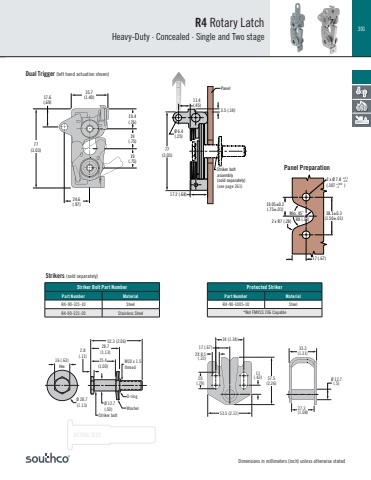 301Dimensions in millimeters (inch) unless otherwise statedR4 Rotary LatchHeavy-Duty · Concealed · Single and Two stage38.1±0.3(1.50±.01)19.05±0.2(.75±.01)2 x Ø 7.8 (.307 ) +0.1-0.0 +.004-.02 x R7 (.28) R8 (.31)Min. 45˚17 (.67)Panel PreparationACTUAL SIZEDual Trigger (left hand actuation shown)16 (.63)HexØ 28.7(1.13) Ø 12.7(.50) WasherO-ringM10 x 1.5thread52.3 (2.06)28.7(1.13)25.4(1.00)2.8(.11)Striker boltStrikers (sold separately)Protected StrikerPart Number MaterialR4-90-1005-10 Steel*Not FMVSS 206 CapableStriker Bolt Part Number Part Number MaterialR4-90-321-10 SteelR4-90-321-20 Stainless Steel33.3(1.31)Ø 12.7(.5)27.353.5 (2.11) (1.08)57.5(2.26)1120 (.43)(.79)2X 8.5(.33)17 (.67)34 (1.34)PanelPull directionStriker boltassembly(sold separately)(see page 261)77(3.03)Ø 6.4(.25)11.4 (.45)17.2 (.68)19.4 (.76)19(.75)2 x Mounting holes (see table)19 (.75)17.8 (.70)35.7 (1.40)3.5 (.14)35.7(1.40)19.4(.76)19(.75)19(.75)24.6(.97)77(3.03)17.6(.69)