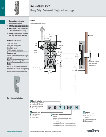 302Dimensions in millimeters (inch) unless otherwise statedBottom(left hand actuation shown)ACTUAL SIZEPanelPull directionStriker bolt assembly(sold separately)(see page 261)77(3.03)17.2 (.68)2 x Mounting holes(see table) 31.8(1.25)17.6(.69) 19.4 (.76)19(.75)19 (.75)17.8 (.70)34.8(1.37)Ø 6.4(.25)www.southco.com/R4R4 - 30 - S I - 50 B - MS Stage & Actuation 1 Single stage, right hand2 Single stage, left hand3 Two stage, right hand4 Two stage, left handM Material 10 Steel, zinc plated15 Steel, black zinc nickel plated77 Steel, clear zinc nickel20 Stainless steelI Mounting Style0 Ø6.7 (.283) thru1 1/4-20 thread2 M6 x 1 thread1 Base Style1 Standard2 Standard with cable bracket for spring3 Standard with cable bracket no spring5 Integrated bumper6 Integrated bumper with cable bracket for spring7 Integrated bumper with cable bracket no springPart Number Selection• Compatible with wide array of actuators• FMVSS 206 capable options• EN 45545-3 E60 compliant (Standard version only)• Integrated bumper versionfor anti-vibration featureMaterial and FinishSteel, zinc platedSteel, zinc nickel plated(black and clear)Stainless steel, passivatedAccessoriesCables and retainer clips see pages 322-323Striker options see page 301NotesR4-38-101-10 support plate sold separately for FMVSS 206 capabilityMounts opposite of latch housing.R4 Rotary LatchHeavy-Duty · Concealed · Single and two stage