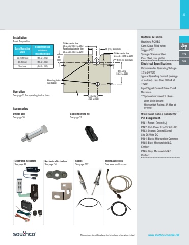31Dimensions in millimeters (inch) unless otherwise statedOperationSee page 21 for operating instructionsAccessoriesStriker BoltSee page 36Cable Mounting KitSee page 37Base Mounting StyleRecommendedminimummounting hole10-24 thread Ø 5.6 (.220)M5 thread Ø 5.9 (.232)Thru hole Ø 6.1 (.240)InstallationPanel PreparationMaterial & FinishHousings: PC/ABSCam: Glass-fi lled nylonTrigger: PBTSprings: Stainless SteelPins: Steel, zinc platedElectrical Specifi cationsRecommended Operating Voltage: 12 to 24 VDCTypical Operating Current (average at no load): Less than 600mA at 12VDCInput Signal Current Dra 25mA Maximum ** Optional microswitch closes upon latch closureMicroswitch Rating: 3A Max at 12 VDCWire Color Code / Connector Pin Assignment:PIN 1: Brown: Ground (-)PIN 2: Red: Power 8 to 26 Volts DCPIN 3: Orange: Control Signal 8 to 26 Volts DCPIN 4: Black: Microswitch CommonPIN 5: Blue: Microswitch N.O. ContactPIN 6: Grey: Microswitch N.C. Contact12V24V14 (.55) Minimum4.0 (.16) MinimumStriker center line2.5 ±0.1 (.098 ±.004)Striker center line15.6 ±1.2 (.614 ±.046)Panel cutout center line15.6 ±0.5 (.614 ±.020)42.5 ±0.2(1.673 ±.008)18 ±0.2 (.709 ±.008)15(.59)Mounting holes(see table)Mechanical ActuatorsSee page 34CablesSee page 322Wiring/JunctionsSee www.southco.comElectronic ActuatorsSee page 48www.southco.com/R4-EM