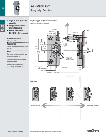 304www.southco.com/R4 Dimensions in millimeters (inch) unless otherwise statedACTUAL SIZE• Single or multi-point latch capability• Compatible with a wide array of actuators• FMVSS 206 capable• EN 45545-3 E60 compliantMaterial and FinishSteel, zinc platedAccessoriesCables and retainer clips see pages 322-323NotesElectromechanical rotary latches available see page 20For panel preparation visit www.southco.com/R4Striker Bolt Assembly (sold separately): R4-90-441-10R4 Rotary LatchHeavy-duty · Two stagePanelPull direction46(1.8)6.5 (.255)42.5(1.67)55.3 (2.18)2.16 (.085)18.6 (.73)46.6 (1.835)Mounting holes (see table)Ø 17.2 (.677)Maximum striker20.24(.797)41.28(1.625)82.55(3.25)109(4.29)3.6 (.142)3.2 (.125)5.7 (.226)20.7(.815)Ø 6.73 (.265)Single Trigger, Perpendicular Actuation(left hand actuation shown)Latched position Unlatched positionOperation