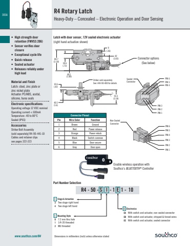 305Awww.southco.com/R4 Dimensions in millimeters (inch) unless otherwise statedR4 Rotary LatchHeavy-Duty – Concealed – Electronic Operation and Door SensingI Stage & Actuation3 Two stage right hand4 Two stage left handI Mounting Style0 7.2 mm thru hole1 1/4-20 threaded2 M6 threadedE ElectronicsEA With switch and actuator, non-sealed connectorEB With switch and actuator, stripped & tinned wiresEC With switch and actuator, sealed connectorPart Number SelectionLatch with door sensor, 12V sealed electronic actuator(right hand actuation shown)R4 - 50 - S I - 1 E 1 - 10Connector PinoutPin Wire Color Function1 Brown Ground2 Red Power release3 Orange Power relock4 Black Switch common5 Blue Door secure6 Grey Door openEnable wireless operation withSouthco’s BLUETOOTH ® ControllerConnector options (See below)9(.36)42(1.65)18.6(.73)80.7(3.18)48.1(1.89)55.5(2.18)40.5(1.6)10.6(.42)Striker sold separatelySee J-R4-90-400 for detailsSealedConnectorPIN 1PIN 4PIN 2PIN 5PIN 3PIN 6Non-SealedConnectorPIN 1PIN 2PIN 3PIN 4PIN 5PIN 6• High strength door retention (FMVSS 206)• Sensor verifies door closure• Exceptional cycle life• Quick release• Sealed actuator• Releases reliably under high loadMaterial and FinishLatch: steel, zinc plate orzinc nickel plateActuator: PC/ABS, acetal,silicone, buna sealsElectronic specifications:Operating voltage 12 VDC nominalOperating current < 600mATemperature -40 to 80°CSealed (IP65)AccessoriesStriker Bolt Assembly(sold separately) R4-90-441-10Cables and retainer clipssee pages 322-323