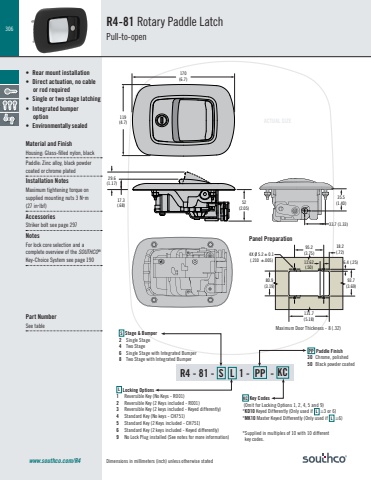306Dimensions in millimeters (inch) unless otherwise statedACTUAL SIZE• Rear mount installation• Direct actuation, no cable or rod required• Single or two stage latching • Integrated bumper option• Environmentally sealedMaterial and FinishHousing: Glass-filled nylon, blackPaddle: Zinc alloy, black powder coated or chrome platedInstallation NotesMaximum tightening torque on supplied mounting nuts 3 Nm (27 inlbf)AccessoriesStriker bolt see page 297NotesFor lock core selection and a complete overview of the SOUTHCO® Key-Choice System see page 190www.southco.com/R4Part NumberSee tableR4-81 Rotary Paddle LatchPull-to-open29.6(1.17)17.3(.68)170(6.7)119(4.7)93.7(3.69)6.4 (.25)95.2(3.75)18.2(.72) 4X Ø 5.2 ± 0.1(.210 ±.005)80.9(3.19)131.7(5.18)52(2.05)12.62(.50)29.6(1.17)17.3(.68)170(6.7)119(4.7)93.7(3.69)6.4 (.25)95.2(3.75)18.2(.72) 4X Ø 5.2 ± 0.1(.210 ±.005)80.9(3.19)131.7(5.18)52(2.05)12.62(.50)R4 - 81 - S L 1 - PP - KCS Stage & Bumper 2 Single Stage4 Two Stage6 Single Stage with Integrated Bumper8 Two Stage with Integrated BumperPP Paddle Finish 30 Chrome, polished50 Black powder coatedL Locking Options1 Reversible Key (No Keys - R001)2 Reversible Key (2 Keys included - R001)3 Reversible Key (2 keys included - Keyed differently)4 Standard Key (No keys - CH751)5 Standard Key (2 Keys included - CH751)6 Standard Key (2 keys included - Keyed differently)9 No Lock Plug installed (See notes for more information)KC Key Codes (Omit for Locking Options 1, 2, 4, 5 and 9)*KD10 Keyed Differently (Only used if L =3 or 6)*MK10 Master Keyed Differently (Only used if L =6)*Supplied in multiples of 10 with 10 different key codes.Panel Preparation29.6(1.17)17.3(.68)170(6.7)119(4.7)93.7(3.69)6.4 (.25)95.2(3.75)18.2(.72) 4X Ø 5.2 ± 0.1(.210 ±.005)80.9(3.19)131.7(5.18)52(2.05)12.62(.50)33.7 (1.33)35.5(1.40)33.7 (1.33)35.5(1.40)Maximum Door Thickness - 8 (.32)