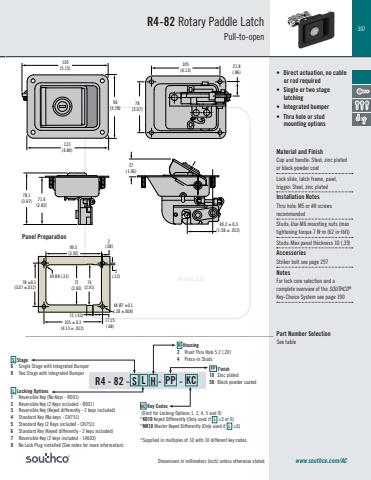 307Dimensions in millimeters (inch) unless otherwise stated www.southco.com/AC• Direct actuation, no cable or rod required• Single or two stage latching• Integrated bumper• Thru hole or stud mounting optionsMaterial and FinishCup and handle: Steel, zinc plated or black powder coatLock slide, latch frame, pawl, trigger: Steel, zinc platedInstallation NotesThru hole: M5 or #8 screws recommendedStuds: Use M6 mounting nuts (max tightening torque 7 Nm (62 inlbf))Studs: Max panel thickness 10 (.39)AccessoriesStriker bolt see page 297NotesFor lock core selection and a complete overview of the SOUTHCO® Key-Choice System see page 190R4-82 Rotary Paddle LatchPull-to-openR4 - 82 - S L H - PP - KCKC Key Codes (Omit for Locking Options 1, 2, 4, 5 and 9)*KD10 Keyed Differently (Only used if L =3 or 6)*MK10 Master Keyed Differently (Only used if L =6)*Supplied in multiples of 10 with 10 different key codes.L Locking Options1 Reversible Key (No Keys - R001)2 Reversible Key (2 Keys included - R001)3 Reversible Key (Keyed differently - 2 keys included)4 Standard Key (No keys - CH751)5 Standard Key (2 Keys included - CH751)6 Standard Key (Keyed differently - 2 keys included)7 Reversible Key (2 keys included - 14603)9 No Lock Plug installed (See notes for more information)PP Finish 10 Zinc plated50 Black powder coatedS Stage6 Single Stage with Integrated Bumper8 Two Stage with Integrated BumperH Housing2 Rivet Thru Hole 5.2 (.20)4 Press-in Studs123(4.84)130(5.15)96(3.78)78.1(3.07) 71.6(2.82)27(1.06)105(4.13)78(3.07)21.8(.86)40.2 ± 0.3(1.58 ± .012) 3(.12)299.5 (.08)(3.92)74(2.91)72(2.83)4X R8 (.31)105 ± 0.3(4.13 ± .012) 11 (.43)17.25(.68)4X Ø7 ±0.1(.28 ±.004)78 ±0.3(3.07 ±.012)ACTUAL SIZEPanel Preparation___________________________________________________________________________ Part Number SelectionSee table
