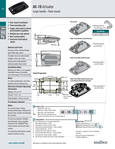 310Dimensions in millimeters (inch) unless otherwise stated131.1(5.16)21.5 (.85)48.9(1.93)43.5(1.71)211.3 (8.32)M6 x 20 (4)137.4(5.41)12X R4(.16)23.1(.91) 32.2(1.27)72(2.84)4X Ø7 ±0.186 ±0.3(3.39 ±.012)152.4 ±0.3(6 ±.01)101(3.98)14(.551)AC - 10 - S L 1 - 11 - KCwww.southco.com/ACAC-10 ActuatorLarge handle · Flush mount• Rear mount installation• Flush mounting style• Single, multi-point or direct pull actuation capability• Multiple key code options• Non-Locking option• Electronic lock/unlock optionMaterial and FinishHousing, handle, rotating linkage: glass-filled nylon, blackThreaded stud and cable bracket retainers: steel, zinc nickelHousing and handle gaskets: adhesive backed foam, blackInstallation NotesMounting nut (M6 x 1) not supplied.Installation torque of mountingnuts not to exceed 7 Nm (62 inlbf)NotesFor cable configuration, see Cable Selection Tool on Southco.com.Electronic Actuator Operating InformationVoltage: 12 V ±1.2 VCurrent: 2.5 A - 3 APulse Duration: 225 ms ±25 msNotes:For use with Rods / Cables. Recommended Snap-in Retainer for Rotator Plate: Southco Part Number R4-0-43922.For lock core selection, detailed key information and a complete overview of the SOUTHCO® KeyChoice System see PK Lock Cores section.For unique key code options, please contact customer service.KC Key Codes (Omit for Locking Options 0, 1, 2, 4, 5 and 9)*KD10 Keyed Differently (Only used if L =3 or 6)*MK10 Master Keyed Differently (Only used if L =6)*Supplied in multiples of 10 with 10 different key codes.*Eliminate 10 for AC-10-EM version(Use KD and MK only)L Locking Options0 Non-Locking (Do not use Actuation Style EM-3)1 Reversible key (No keys - R001)2 Reversible key (2 keys included - R001)3 Reversible key (keyed differently - 2 keys included)4 Standard key (No keys - CH751)5 Standard key (2 keys included - CH751)6 Standard key (keyed differently - 2 keys included)7 Reversible Key (2 keys included - 14603)9 No Lock Plug installed (See notes for more information)• Recommended to use with Trigger Pull• Recommended to use with Rods• Recommended foruse with Cables.Part NumberTrigger Pull R4-0-51292218 120348455Ø 7 (3) 12034 1635 10538,1 29,82,965Direct PullMulti-Point Without Cable BracketPanel PreparationMulti-Point With Cable BracketPart Number Selection _______________________________________________________________________________Multi-Point With Cable Bracket andLock/Unlock Electronic Actuator• Recommended foruse with Cables.MaximumPanel Thickness S Actuation Style1 Single Point, Direct Pull2 Multi-Point, without Cable Bracket3 Multi-Point, with Cable BracketEM-3 Multi-Point with Cable Bracket and Electronic Lock/Unlock (Do not use Locking Option 0)