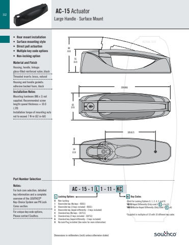 312Dimensions in millimeters (inch) unless otherwise stated AC-15 ActuatorLarge Handle · Surface Mount• Rear mount installation• Surface mounting style• Direct pull actuation• Multiple key code options• Non-locking optionMaterial and FinishHousing, handle, linkage: glass-filled reinforced nylon, blackThreaded inserts: brass, naturalHousing and handle gaskets: adhesive backed foam, blackInstallation NotesMounting hardware (M6 x 1) not supplied. Recommended screw length=panel thickness + 10.0 (.39)Installation torque of mounting nuts not to exceed 7 Nm (62 in-lbf)3X Ø 7 (.3) 120 (4.7)34(1.34)16(.6)35(1.4)105(4.1)38.1(1.50) 29.8(1.17)2.9 (.11)218 (8.6)84(3.3)55(2.2)65(2.5)120 (4.7)34(1.3)3X Ø 7 (.3) 120 (4.7)34(1.34)16(.6)35(1.4)105(4.1)38.1(1.50) 29.8(1.17)2.9 (.11)218 (8.6)84(3.3)55(2.2)65(2.5)120 (4.7)34(1.3)3X Ø 7 (.3) 120 (4.7)34(1.34)16(.6)35(1.4)105(4.1)38.1(1.50) 29.8(1.17)2.9 (.11)218 (8.6)84(3.3)55(2.2)65(2.5)120 (4.7)34(1.3)AC - 15 - 1 L 1 - 11 - KCKC Key Codes (Omit for Locking Options 0, 1, 2, 4, 5 and 9)*KD10 Keyed Differently (Only used if L =3 or 6)*MK10 Master Keyed Differently (Only used if L =6)*Supplied in multiples of 10 with 10 different key codesL Locking Options0 Non-Locking1 Reversible key (No keys - R001)2 Reversible key (2 keys included - R001)3 Reversible key (keyed differently - 2 keys included)4 Standard key (No keys - CH751)5 Standard key (2 keys included - CH751)6 Standard key (keyed differently - 2 keys included)9 No Lock Plug installed (See notes for more information)ACTUAL SIZEPart Number Selection _______________________________________________________________________________Notes:For lock core selection, detailed key information and a complete overview of the SOUTHCO®Key-Choice System see PK Lock Cores section.For unique key code options,Please contact Southco.