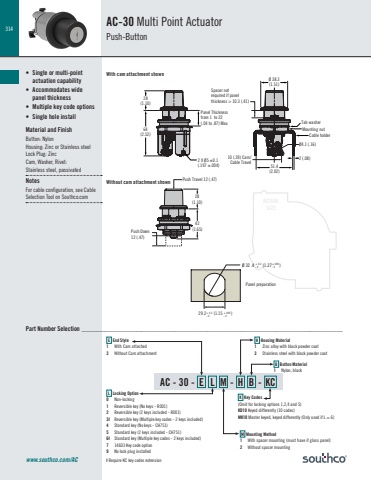 314Dimensions in millimeters (inch) unless otherwise statedAC - 30 - E L M - H B - KCACTUALSIZEL Locking Option0 Non-locking1 Reversible key (No keys - R001)2 Reversible key (2 keys included - R001)3ł Reversible key (Multiple key codes - 2 keys included)4 Standard key (No keys - CH751)5 Standard key (2 keys included - CH751)6ł Standard key (Multiple key codes - 2 keys included)7 14603 Key code option9 No lock plug installed ł Require KC key codes extensionM Mounting Method1 With spacer mounting (must have if glass panel)2 Without spacer mountingE End Style1 With Cam attached 3 Without Cam attachment B Button Material1 Nylon, black H Housing Material1 Zinc alloy with black powder coat3 Stainless steel with black powder coatK Key Codes(Omit for locking options 1,2,4 and 5)KD10 Keyed differently (10 codes)MK10 Master keyed, keyed differently (Only used if L = 6)10 (.39) Cam/Cable TravelØ 38.3(1.51)2 (.08)Ø4.1 (.16)28(1.10)64(2.52)2 X Ø5 ±0.1(.197 ±.004)Spacer not required if panel thickness > 10.3 (.41)Tab washerMounting nutPanel Thicknessfrom 1 to 22(.04 to .87) MaxPush Travel 12 (.47)28(1.10)Ø 32 .4 (1.27 ) + 0.2- 0+.008- 029.2 (1.15 )Panel preparation+ 0.2- 0+.008- 042(1.65) Push Down 12 (.47)51.4(2.02)Cable holderAC-30 Multi Point ActuatorPush-Button• Single or multi-point actuation capability• Accommodates wide panel thickness• Multiple key code options• Single hole installMaterial and FinishButton: NylonHousing: Zinc or Stainless steelLock Plug: ZincCam, Washer, Rivet: Stainless steel, passivatedNotesFor cable configuration, see Cable Selection Tool on Southco.comwww.southco.com/ACPart Number Selection _______________________________________________________________________________With cam attachment shownWithout cam attachment shown