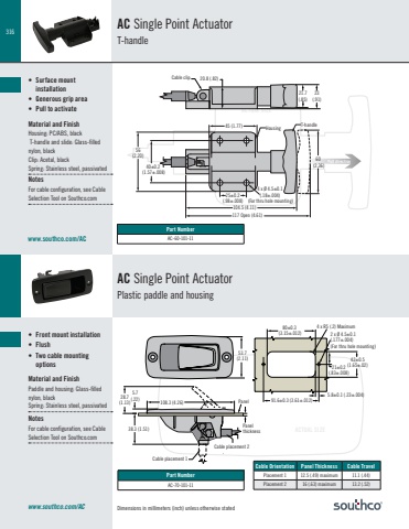 316Dimensions in millimeters (inch) unless otherwise statedACTUAL SIZEACTUAL SIZEPull direction45 (1.77) Housing T-handle60 (2.36)104.5 (4.11)117 Open (4.61)25±0.2(.98±.008)40±0.2 (1.57±.008)4 x Ø 4.5±0.1 (.18±.004) (For thru hole mounting)56(2.20)Cable clip 20.8 (.82)21.7(.85)23(.91)108.3 (4.26) PanelPanel thicknessCable placement 15.7(.22)38.3 (1.51)53.7(2.11)28.7(1.13)80±0.3 (3.15±.012) 2 x Ø 4.5±0.1 (.177±.004)(For thru hole mounting)91.6±0.3 (3.61±.012)5.8±0.1 (.23±.004)42±0.5(1.65±.02) 21±0.2(.83±.008)4 x R5 (.2) MaximumCable placement 2Part NumberAC-60-101-11Part NumberAC-70-101-11Cable Orientation Panel Thickness Cable TravelPlacement 1 12.5 (.49) maximum 11.1 (.44) Placement 2 16 (.63) maximum 13.2 (.52)• Surface mount installation• Generous grip area• Pull to activateMaterial and FinishHousing: PC/ABS, black T-handle and slide: Glass-filled nylon, blackClip: Acetal, blackSpring: Stainless steel, passivatedNotesFor cable configuration, see Cable Selection Tool on Southco.comAC Single Point ActuatorT-handleAC Single Point ActuatorPlastic paddle and housingwww.southco.com/AC• Front mount installation• Flush• Two cable mounting optionsMaterial and FinishPaddle and housing: Glass-filled nylon, blackSpring: Stainless steel, passivatedNotesFor cable configuration, see Cable Selection Tool on Southco.comwww.southco.com/AC
