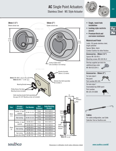 319Dimensions in millimeters (inch) unless otherwise statedACTUAL SIZEACTUAL SIZEØ 61Locking handle shown(also available as non-locking)Ø 4438mm (1.5”)Shown actual size50mm (2”)Shown actual sizeAC Single Point ActuatorsStainless Steel · M1 Style ActuatorCablesFor cable configuration, see Cable Selection Tool on Southco.com• Single, round-hole installation• Locking style restricts access• Premium finish and corrosion resistanceMaterial and FinishLatch: 316 grade stainless steel, bright polishedSpacer: Nylon, blackContact Southco for other finishesAccessories - 38mm (1.5”)Spacer: M1-510-96-1Mounting screws: M1-510-96-4One key supplied per latch for additional keys order M7-88-9121324-SAccessories - 50mm (2”)For lock style 4Key (pair)Part number: M1-546For lock style 7Overmolded key S008 (pair)Part number: M1-525-39-S008www.southco.com/ACACTUAL SIZEACTUAL SIZEØ 61(2.41)Locking handle shown(also available as non-locking)Ø 44(1.73)ACTUAL SIZEACTUAL SIZEØ 61(2.41)Locking handle shown(also available as non-locking)Ø 44(1.73)Size Actuator Assembly Part Number Door ThicknessCable Mounting Bracket38mm(1.5)Locking (2 keys supplied) AC-M1-15-41-89 mm R4-0-50253-112 mm R4-0-50253-2Non-Locking AC-M1-15-61-89 mm R4-0-50253-112 mm R4-0-50253-250mm(2)Locking (2 keys supplied)AC-M1-42-8 9 mm R4-0-50253-1AC-M1-43-8 12 mm R4-0-50253-2Non-LockingAC-M1-62-8 9 mm R4-0-50253-1AC-M1-63-8 12 mm R4-0-50253-2Key-Locking keyed alike S008AC-M1-72-8 9 mm R4-0-50253-1AC-M1-73-8 12 mm R4-0-50253-2 Ø38.1 ±0.5 (1.50 ±.02) Ø50 (2.00 ) + 1.2- 0 + .015- .031Ø 44(1.73)Cable travel 13 (.5)Cable travel 13 (.5) Cable retainer (Sold separately)See table (Mounting screw not included)Ø 61(2.41)2.5 (.10) Small Version3 (.12) Large VersionDoor thickness (See part number builder)34(1.34)DoorDoorDoor thickness (See part number builder)Cable Mounting Bracket34(1.34)Actuator Assembly(38mm (1.5) shown)Retainer Clip (Sold separately)R4-0-43922-2Cable mounting bracket (Sold separately) See page 323 (1/8” Mounting screws not included)Phillips Recess Pan Head Mounting Screws (included)Mounting Bracket38mm (1.5)50mm (2)13 (.5)2.5 (.10)3 (.12) 34(1.34)Cable Mounting BracketCable TravelDoorDoor Thickness38mm (1.5)50mm (2)