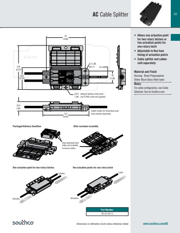 321Dimensions in millimeters (inch) unless otherwise statedPULLPULL15 (.59)30(1.18)97(3.82)110(4.31)54.2(2.15)23.4(.92)115(4.53)ø 4.5(.18)4.5 (.18)dia x 3• Allows one actuation point for two rotary latches or two actuation points for one rotary latch• Adjustable to fine tune timing of actuation points• Cable splitter and cables sold separatelyMaterial and FinishHousing: Black PolypropyleneSlider: Black Glass-filled nylonNotesFor cable configuration, see Cable Selection Tool on Southco.comPart Number AC-05-301-11One actuation point for two rotary latchesPackaged Delivery Condition After customer assemblyTwo actuation points for one rotary latchAC Cable Splitteroptional locking screw point - use PT K60 screw not suppliedCables shown for illustration only - to be ordered separatelyClips detached from slider and installed to secure cables.Latches LatchActuator Actuatorswww.southco.com/ACPULLPULLPULLPULLACTUAL SIZE