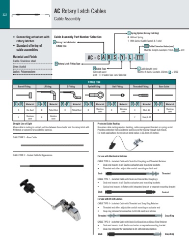 322Dimensions in millimeters (inch) unless otherwise statedSnub ConicalThreaded Snap RingCable Assembly Part Number SelectionS Spring Option (Rotary End Only)0 Without Spring1 With Spring (Cable Types 6 & 7 only)L Cable Length (mm)Must be 4 digits. Example: 250mm, L = 0250 Y Cable Type(See next page)Omit -TTT if Cable Type 1 or 2 SelectedA Rotary Latch Actuator Fitting TypeR Rotary Latch Fitting Type• Connecting actuators with rotary latches• Standard offering of cable assembliesMaterial and FinishCable: Stainless steelLiner: AcetalJacket: PolypropyleneFitting TypeBarrel Fitting L Fitting Z Fitting Eyelet Fitting Ball Fitting Threaded Fitting Bare CableMaterial Material Material Material Material Material MaterialA Die-Cast B Plated Steel C Plated Steel D Stainless Steel H Stainless Steel E Steel, M4 O Stainless SteelJ Stainless Steel K Stainless Steel F Steel, 8-32A & R A & R A & R A & R A & R A & R A & RAC Rotary Latch CablesCable AssemblyAC - C A R S - Y - L - TTTTTT Cable Extension Value (mm)Must be 3 digits. Example 79 mm, TTT = 079Snub ThreadedSnub Snap RingFor use with R4-EM LatchesCABLE TYPE 4 - Jacketed Cable with Threaded and Snap Ring Retainer• Threaded end offers adjustable conduit mounting on actuator end• Snap ring retainer for connection to R4-EM electronic latchesCABLE TYPE 8 - Jacketed Cable with Snub End Coupling and Snap Ring Retainer• Snub end mounts to all Southco actuators or separate mounting bracket• Snap ring retainrer for connection to R4-EM electronic latchesStraight Line of SightWhen cable is routing in a direct pull line between the actuator and the rotary latch with NO bends or concerns for accidental opening.CABLE TYPE 1 - Bare CableCABLE TYPE 2 - Coated Cable for AppearanceProtected Cable RoutingUse when cable routing requires bending, cable management brackets or spring assist. Provides protection from accidental opening and for routing through bulk heads.For most applications the minimum bend radius is 50.8 mm (2 inches).For use with Mechanical LatchesCABLE TYPE 6 - Jacketed Cable with Snub End Coupling and Threaded Retainer• Snub end mounts to all Southco actuators and mounting brackets• Threaded end offers adjustable conduit mounting on latch endCABLE TYPE 7 - Jacketed Cable with Snub and Conical End Couplings• Snub end mounts to all Southco actuators and mounting brackets• Conical end mounts to Rotary with integrated bracket or separate mounting bracket