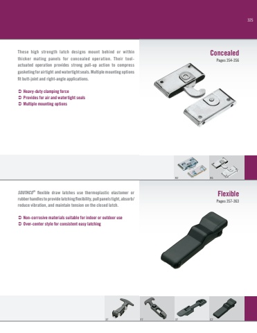 325These high strength latch designs mount behind or within thicker mating panels for concealed operation. Their toolactuated operation provides strong pull-up action to compress gasketing for airtight and watertight seals. Multiple mounting options fit butt-joint and right-angle applications.Ü Heavy-duty clamping forceÜ Provides for air and watertight sealsÜ Multiple mounting optionsSOUTHCO® flexible draw latches use thermoplastic elastomer or rubber handles to provide latching flexibility, pull panels tight, absorb/reduce vibration, and maintain tension on the closed latch.Ü Non-corrosive materials suitable for indoor or outdoor useÜ Over-center style for consistent easy latchingConcealedPages 354-35637 F7 37 C7R2 R5FlexiblePages 357-363