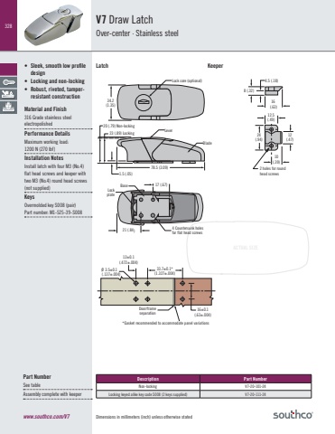 328Dimensions in millimeters (inch) unless otherwise statedACTUAL SIZEwww.southco.com/V7• Sleek, smooth low profile design • Locking and non-locking• Robust, riveted, tamperresistant constructionMaterial and Finish316 Grade stainless steel electropolishedPerformance DetailsMaximum working load:1200 N (270 lbf)Installation NotesInstall latch with four M3 (No.4) flat head screws and keeper with two M3 (No.4) round head screws (not supplied)KeysOvermolded key S008 (pair)Part number: M1-525-39-S008V7 Draw LatchOver-center · Stainless steelPart NumberSee tableAssembly complete with keeperDescription Part NumberNon-locking V7-20-101-24Locking keyed alike key code S008 (2 keys supplied) V7-20-111-2478.5 (3.09)34.2(1.35)21 (.84)23 (.89) Locking1.5 (.05)Lock core (optional)BaseBladeLever17 (.67)20 (.79) Non-lockingLockplate4 Countersunk holesfor flat head screws 24(.94)4.5 (.18)8 (.32)16 (.63)12(.47)10(.39)12.5(.49)Door/frameseparation3.5±0.1(.137±.004)Ø12±0.1(.472±.004)16±0.1(.63±.004)33.7±0.1*(1.327±.004)*Gasket recommended to accommodate panel variationsLatch Keeper2 holes for roundhead screws
