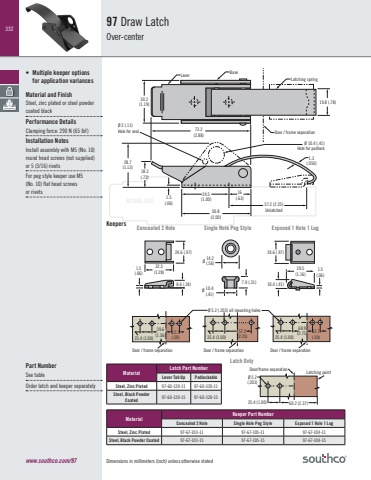 332ACTUAL SIZEDimensions in millimeters (inch) unless otherwise stated• Multiple keeper options for application variancesMaterial and FinishSteel, zinc plated or steel powder coated blackPerformance DetailsClamping force: 290 N (65 lbf)Installation NotesInstall assembly with M5 (No. 10)round head screws (not supplied) or 5 (3/16) rivetsFor peg style keeper use M5 (No. 10) flat head screws or rivets97 Draw LatchOver-center www.southco.com/97Concealed 2 Hole Single Hole Peg StyleMaterial Keeper Part NumberConcealed 2 Hole Single Hole Peg Style Exposed 1 Hole 1 LugSteel, Zinc Plated 97-67-103-11 97-67-105-11 97-67-104-11Steel, Black Powder Coated 97-67-103-15 97-67-105-15 97-67-104-15Exposed 1 Hole 1 Lug Keepers30.2(1.19)Latching springBase Lever19.8 (.78)18.3(.72)1.5(.06)73.2(2.88)16(.63)50.8(2.00)57.2 (2.25)Unlatched1.3(.050)Ø 2 (.11)Hole for sealØ 10.4 (.41)Hole for padlock28.7(1.13)Door / frame separation24.5(1.00)8.6 (.34)24.6 (.97)32.5(1.28)1.5(.06)10.4(.41)Ø 14.2(.56)7.9 (.31)Ø24.6 (.97)29.5(1.16)10.4 (.41)1.5(.06)Ø 5.2 (.203) all mounting holes25.4 (1.00)39.6(1.56) 12.7(.50) 25.4 (1.00)57.2(2.25) 25.4 (1.00)69.9(2.75) 12.7(.50)Door / frame separation Door / frame separation Door / frame separationPart NumberSee tableOrder latch and keeper separatelyMaterialLatch Part NumberLever Tab Up PadlockableSteel, Zinc Plated 97-60-120-11 97-60-320-11Steel, Black Powder Coated 97-60-120-15 97-60-320-15Ø 5.2(.203)25.4 (1.00) 60.2 (2.37)Door/frame separation Latching pointLatch Only